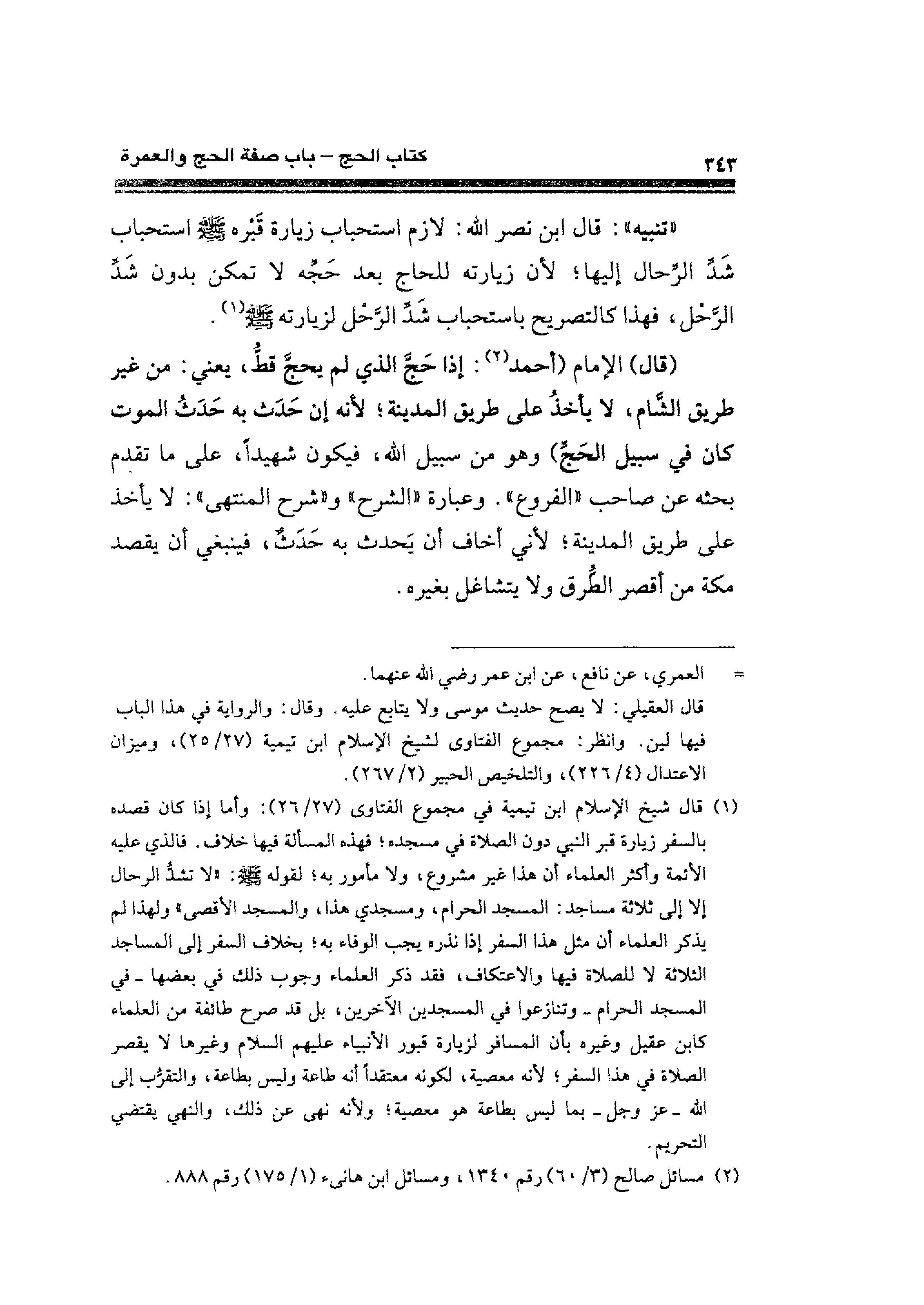 "تنبيه": قال ابن نصر الله: لازم استحباب زيارة قَبْره - صلى الله عليه وسلم - استحباب شَدِّ الرِّحال إليها؛ لأن زيارته للحاج بعد حَجِّه لا تمكن بدون شَدِّ الرَّحْل، فهذا كالتصريح باستحباب شَدِّ الرَّحْل لزيارته - صلى الله عليه وسلم - (¬١).
