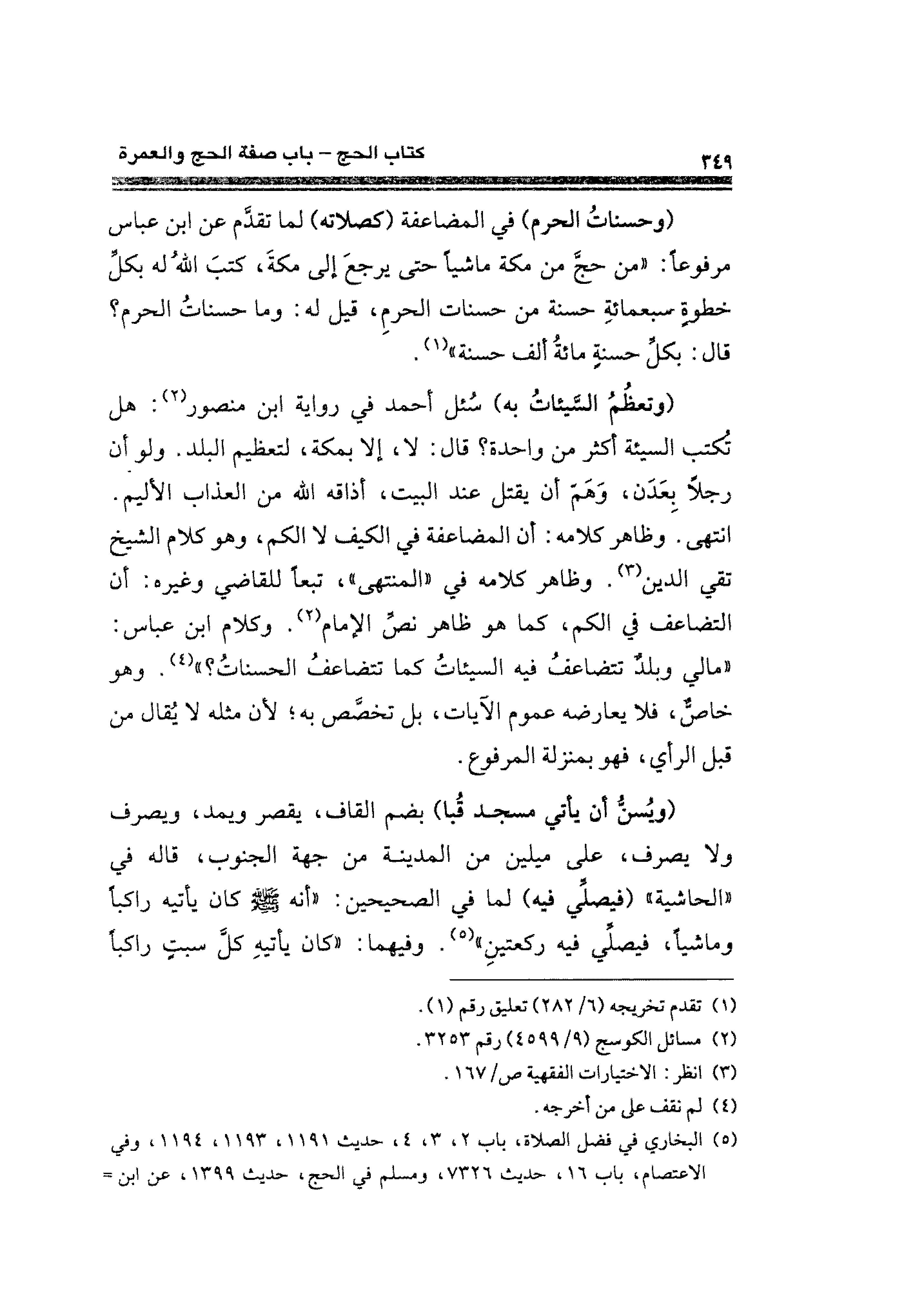 (وتعظُمُ السَّيئاتُ به) سُئل أحمد في رواية ابن منصور (¬٢): هل يُكتب السيئة أكثر من واحدة؟ قال: لا، إلا بمكة؛ لتعظيم البلد. ولو أن رجلاً بِعَدَن، وَهَمّ أن يقتل عند البيت، أذاقه الله من العذاب الأليم. انتهى. وظاهر كلامه: أن المضاعفة في الكيف لا الكم، وهو كلام الشيخ تقي الدين (¬٣). وظاهر كلامه في "المنتهى"، تبعاً للقاضي وغيره: أن التضاعف في الكم، كما هو ظاهر نصِّ الإمام (٢). وكلام ابن عباس: "مالي وبلدٌ تتضاعفُ فيه السيئاتُ كما تتضاعفُ الحسناتُ؟ " (¬٤). وهو خاصٌّ، فلا يعارضه عموم الآيات، بل تخصَّص به؛ لأن مثله لا يُقال من قبل الرأي، فهو بمنزلة المرفوع.