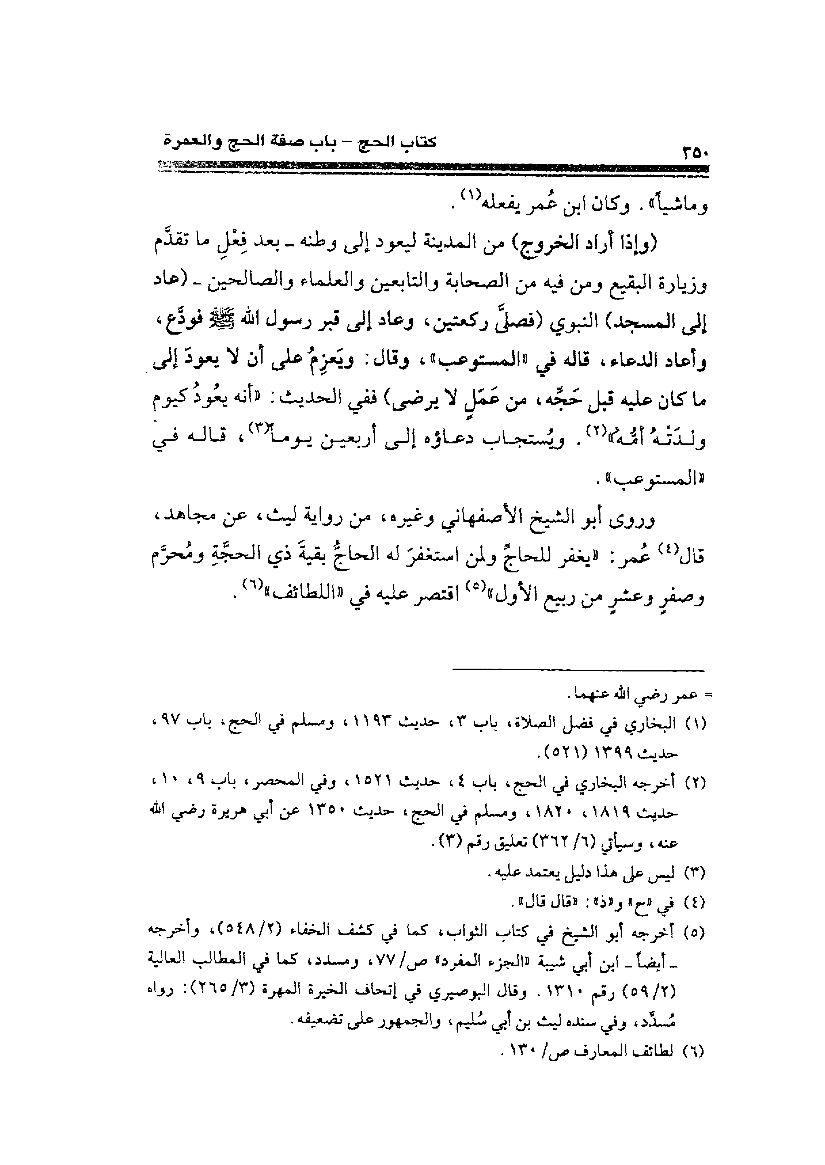 (وإذا أراد الخروج) من المدينة ليعود إلى وطنه - بعد فِعْلِ ما تقدَّم وزيارة البقيع ومن فيه من الصحابة والتابعين والعلماء والصالحين - (عاد إلى المسجد) النبوي (فصلَّى ركعتين، وعاد إلى قبر رسول الله - صلى الله عليه وسلم - فودَّع، وأعاد الدعاء، قاله في "المستوعب"، وقال: ويَعزِمُ على أن لا يعودَ إلى ما كان عليه قبل حَجِّه، من عَمَلٍ لا يرضى) ففى الحديث: "أنه يعُودُ كيوم ولدَتْهُ أمُّهُ" (¬٢). ويُستجاب دعاؤه إلى أربعين يوماً (¬٣)، قاله في "المستوعب".