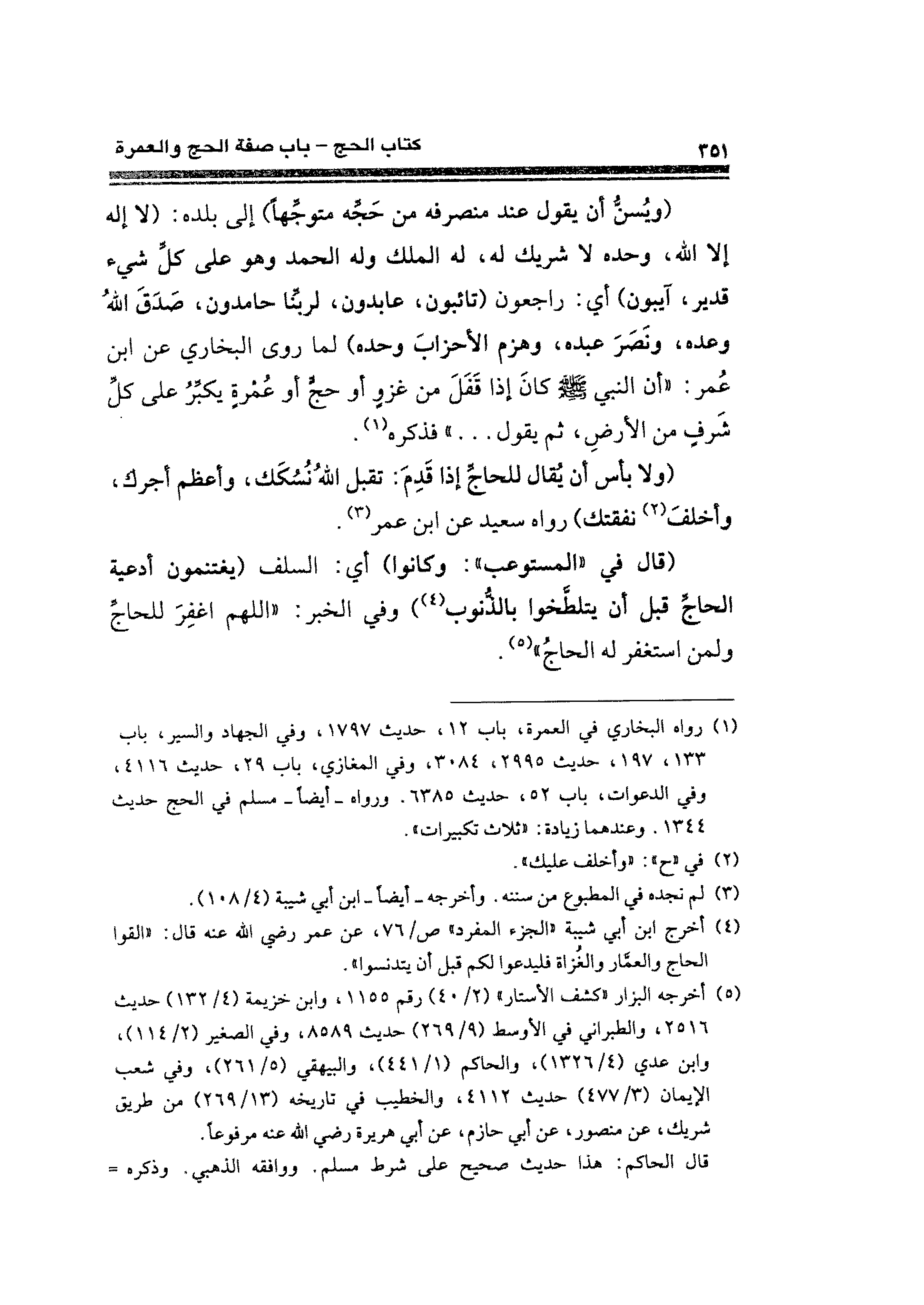 (ويُسنُّ أن يقول عند منصرفه من حَجِّه متوجِّهًا) إلى بلده: (لا إله إلا الله، وحده لا شريك له؛ له الملك وله الحمد وهو على كلِّ شيء قدير، آيبون) أي: راجعون (تائبون، عابدون؛ لربِّنا حامدون، صَدَقَ الله وعده، ونَصَرَ عبده، وهزم الأحزابَ وحده) لما روى البخاري عن ابن عُمر: "أن النبي - صلى الله عليه وسلم - كانَ إذا قَفَلَ من عْزوٍ أو حجٍّ أو عُمْرةٍ يكبِّرُ على كلِّ شَرفٍ من الأرضِ، ثم يقول. . . " فذكره (¬١).