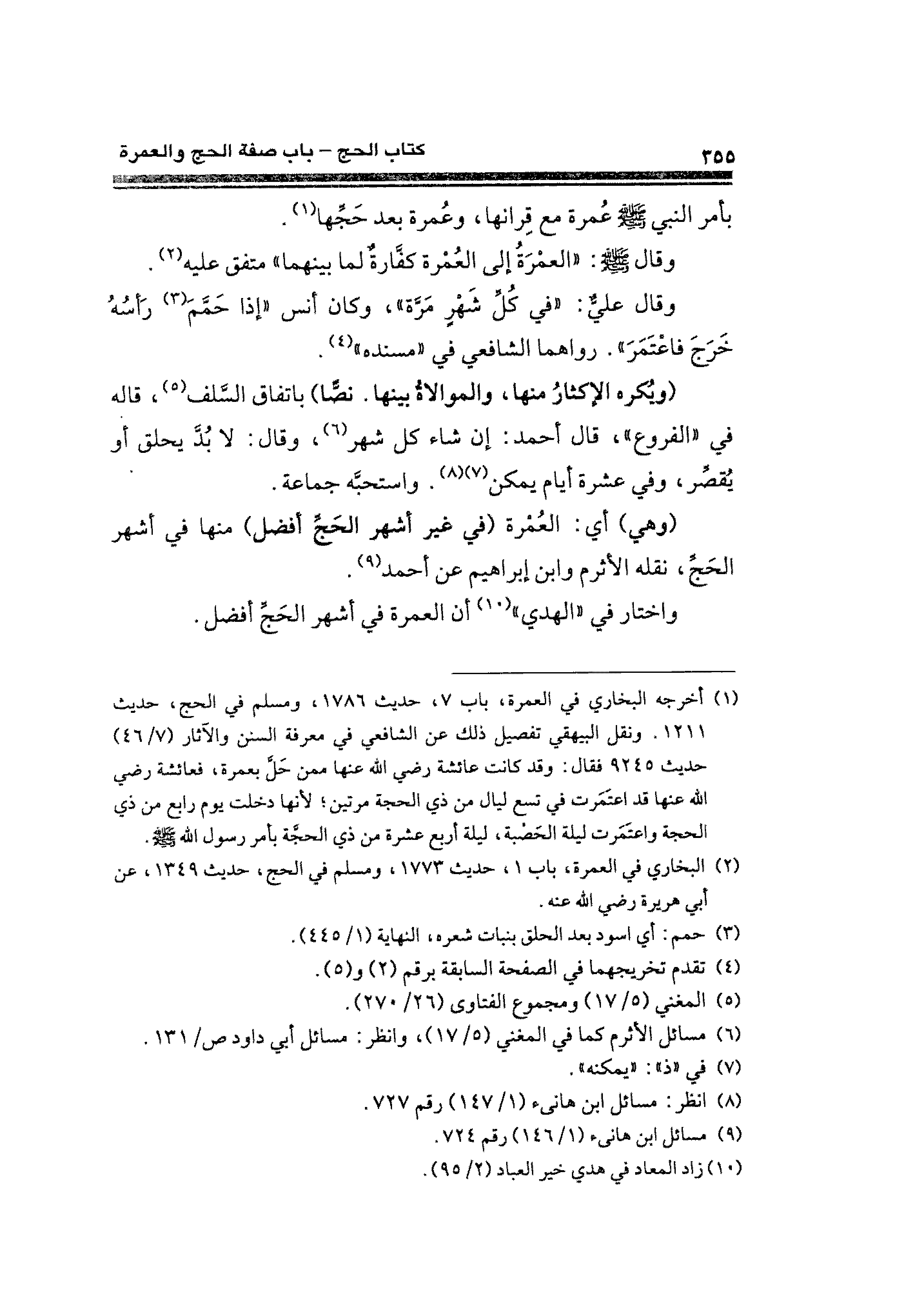 (ويُكره الإكثارُ منها، والموالاةُ بينها. نصًّا) باتفاق السَّلف (¬٥)، قاله في "الفروع"، قال أحمد: إن شاء كل شهر (¬٦)، وقال: لا بُدَّ يحلق أو يُقصِّر، وفي عشرة أيام يمكن (¬٧) (¬٨). واستحبَّه جماعة.
