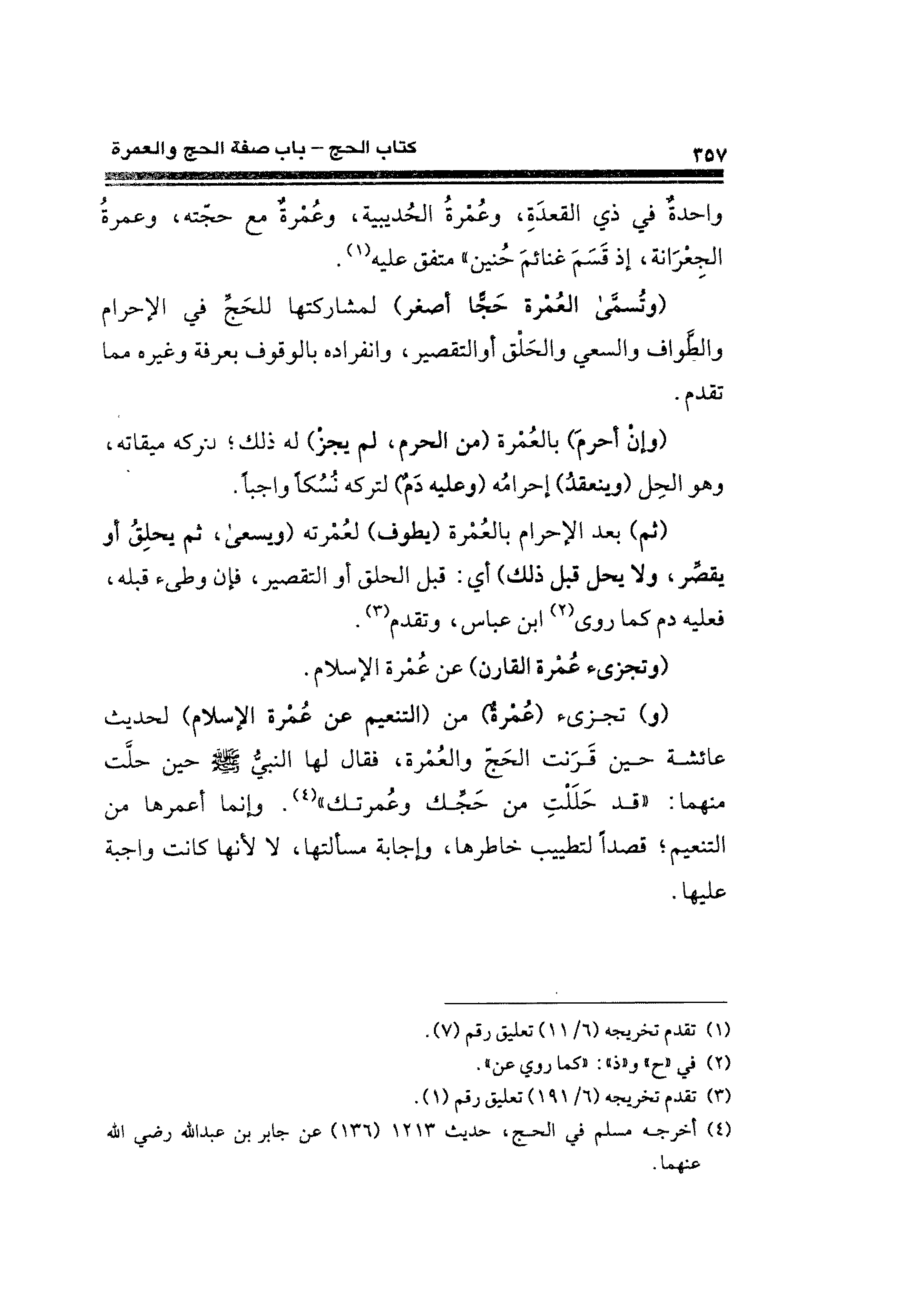 (و) تجزئ (عُمْرةٌ) من (التنعيم عن عُمرة الإسلام) لحديث عائشة حين قَرَنت الحَجْ والعُمْرة، فقال لها النبيُّ - صلى الله عليه وسلم - حين حلَّت منهما: "قد حَلَلْتِ من حَجِّك وعُمرتك" (¬٤). وإنما أعمرها من التنعيم؛ قصدًا لتطييب خاطرها، وإجابة مسألتها، لا لأنها كانت واجبة عليها.