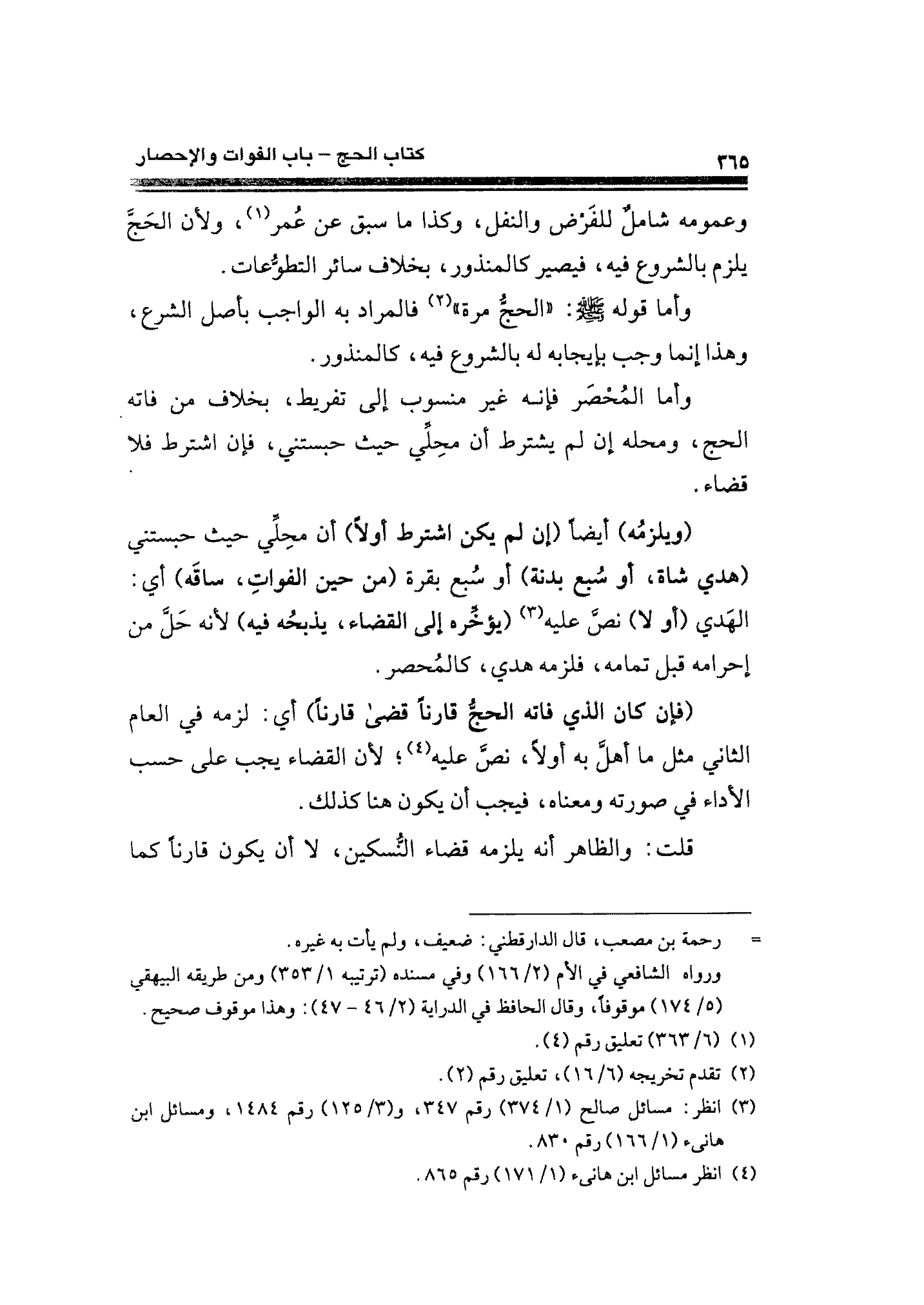 وأما المُحْصَر فإنه غير منسوب إلى تفريط، بخلاف من فاته الحج، ومحله إن لم يشترط أن محِلِّي حيث حبستني، فإن اشترط فلا قضاء.