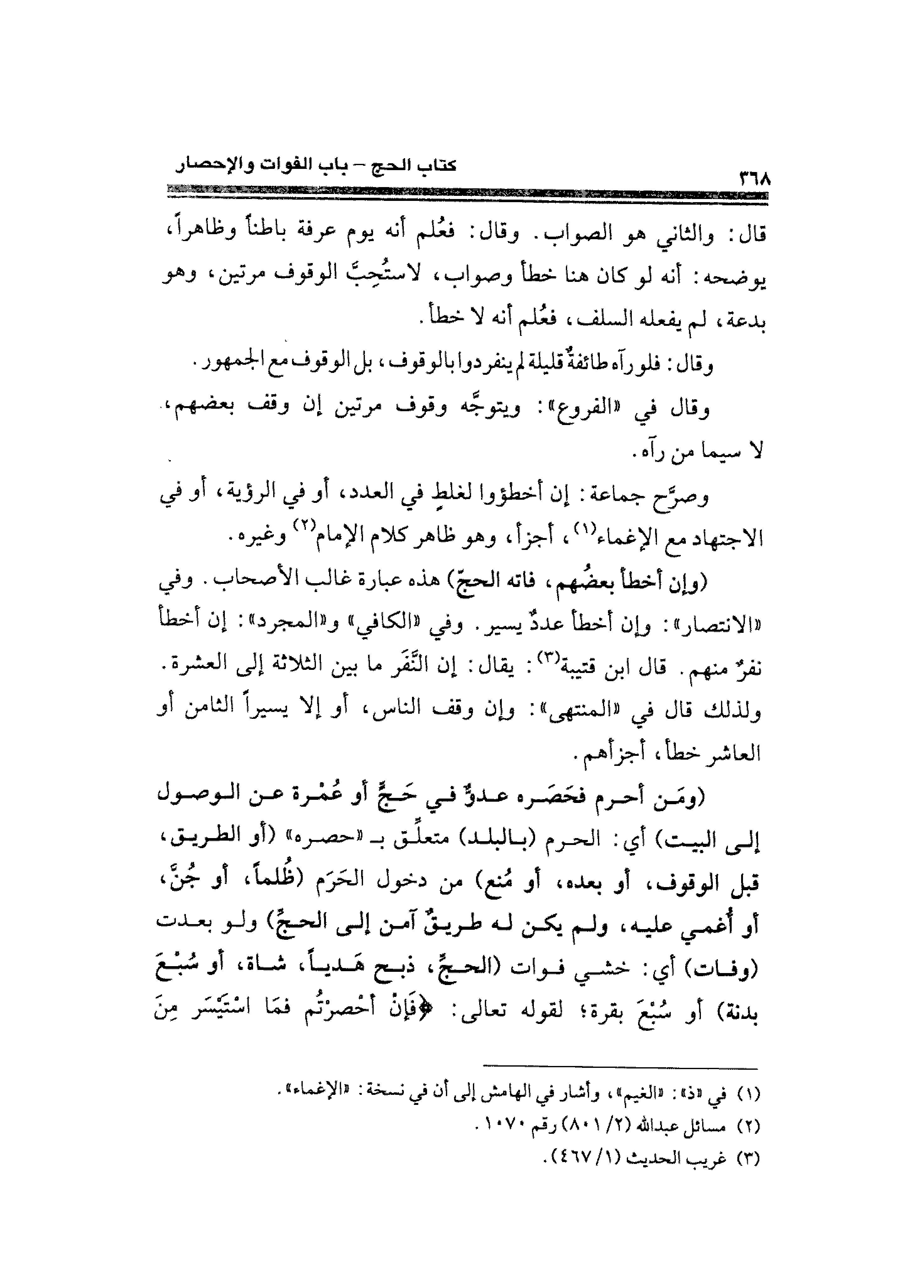 (وإن أخطأ بعضُهم، فاته الحجّ) هذه عبارة غالب الأصحاب. وفي "الانتصار": وإن أخطأ عددٌ يسير. وفي "الكافي" و "المجرد": إن أخطأ نفرٌ منهم. قال ابن قتيبة (¬٣): يقال: إن النَّفَر ما بين الثلاثة إلى العشرة. ولذلك قال في "المنتهى": وإن وقف الناس، أو إلا يسيرًا الثامن أو العاشر خطأ، أجزأهم.