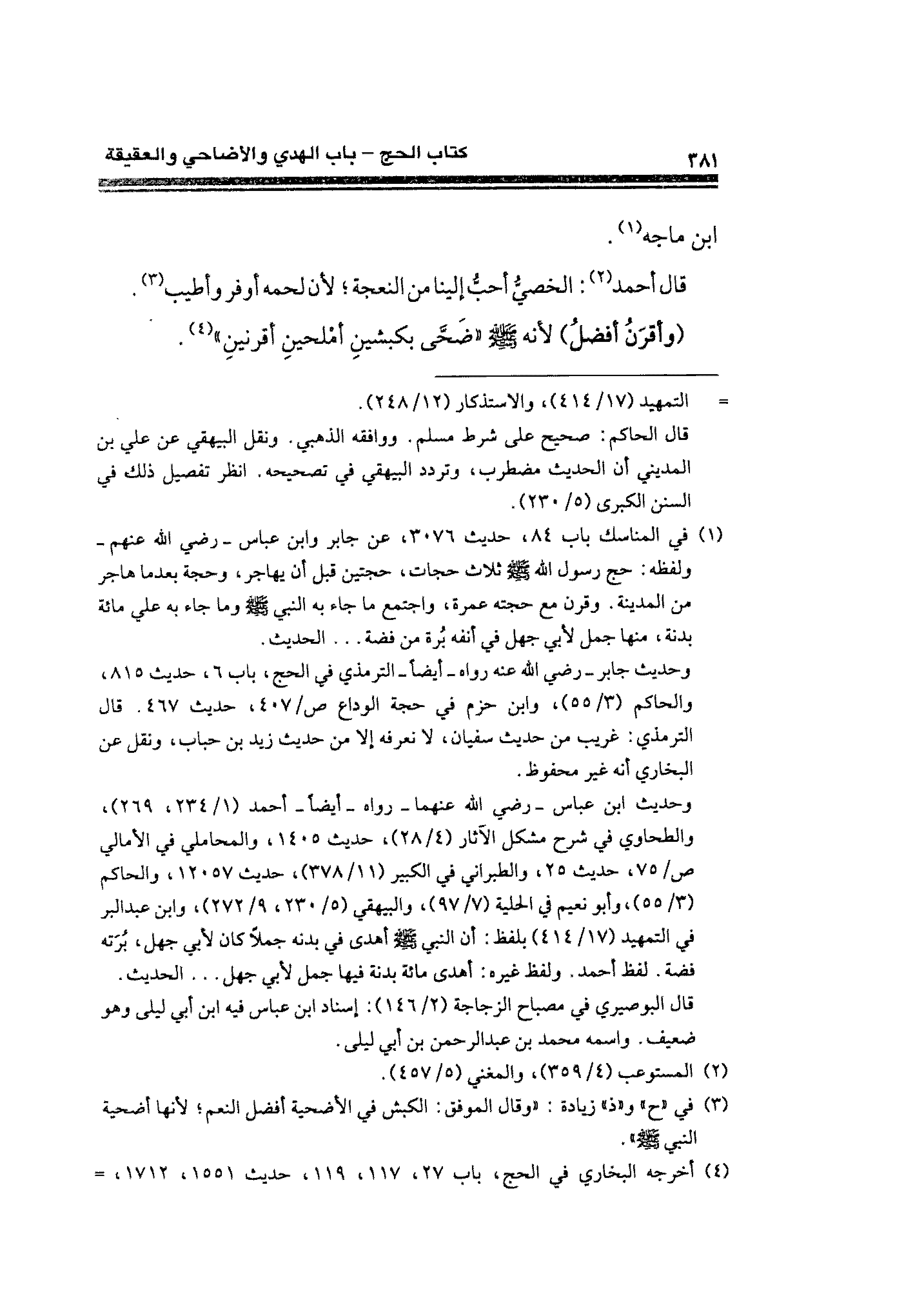 وحديث ابن عباس - رضي الله عنهما - رواه -أيضًا- أحمد (١/ ٢٣٤، ٢٦٩)، والطحاوي في شرح مشكل الآثار (٤/ ٢٨)، حديث ١٤٠٥، والمحاملي في الأمالي ص / ٧٥، حديث ٢٥، والطبراني في الكبير (١١/ ٣٧٨)، حديث ١٢٠٥٧، والحاكم (٣/ ٥٥)، وأبو نعيم في الحيلة (٧/ ٩٧)، والبيهقي (٥/ ٢٣٠، ٩/ ٢٧٢)، وابن عبد البر في التمهيد (١٧/ ٤١٤) بلفظ: أن النبي - صلى الله عليه وسلم - أهدى في بدنه جملًا كان لأبي جهل، بُرَته فضة. لفظ أحمد. ولفظ غيره: أهدى مائة بدنة فيها جمل لأبي جهل ... الحديث.