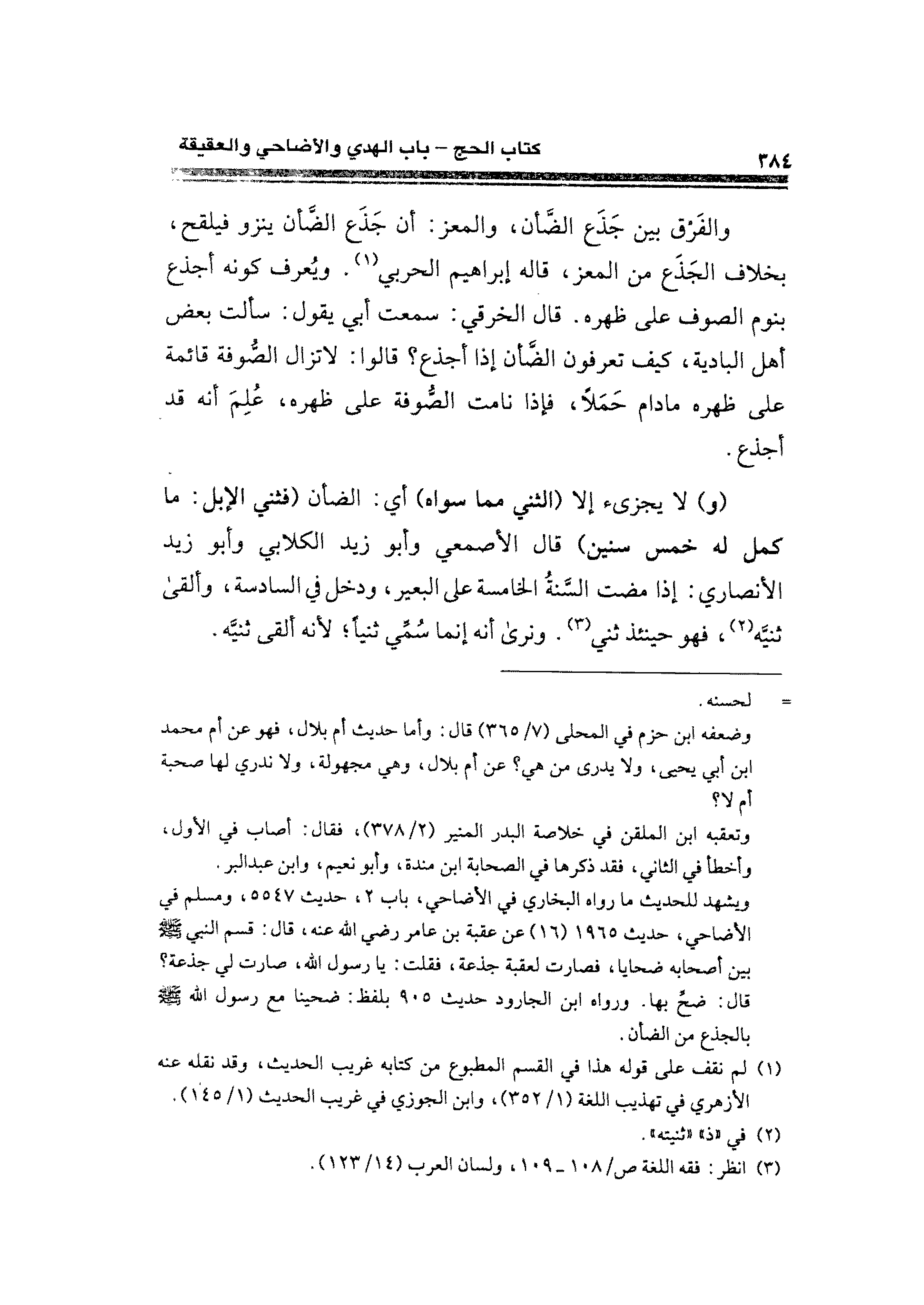 (و) لا يجزئ إلا (الثني مما سواه) أي: الضأن (فثني الإبل: ما كمل له خمس سنين) قال الأصمعي وأبو زيد الكلابي وأبو زيد الأنصاري: إذا مضت السَّنةُ الخامسة على البعير، ودخل في السادسة، وألقى ثنيَّه (¬٢)، فهو حينئذ ثني (¬٣). ونرى أنه إنما سُمِّي ثنيًا؛ لأنه ألقى ثنيَّه.