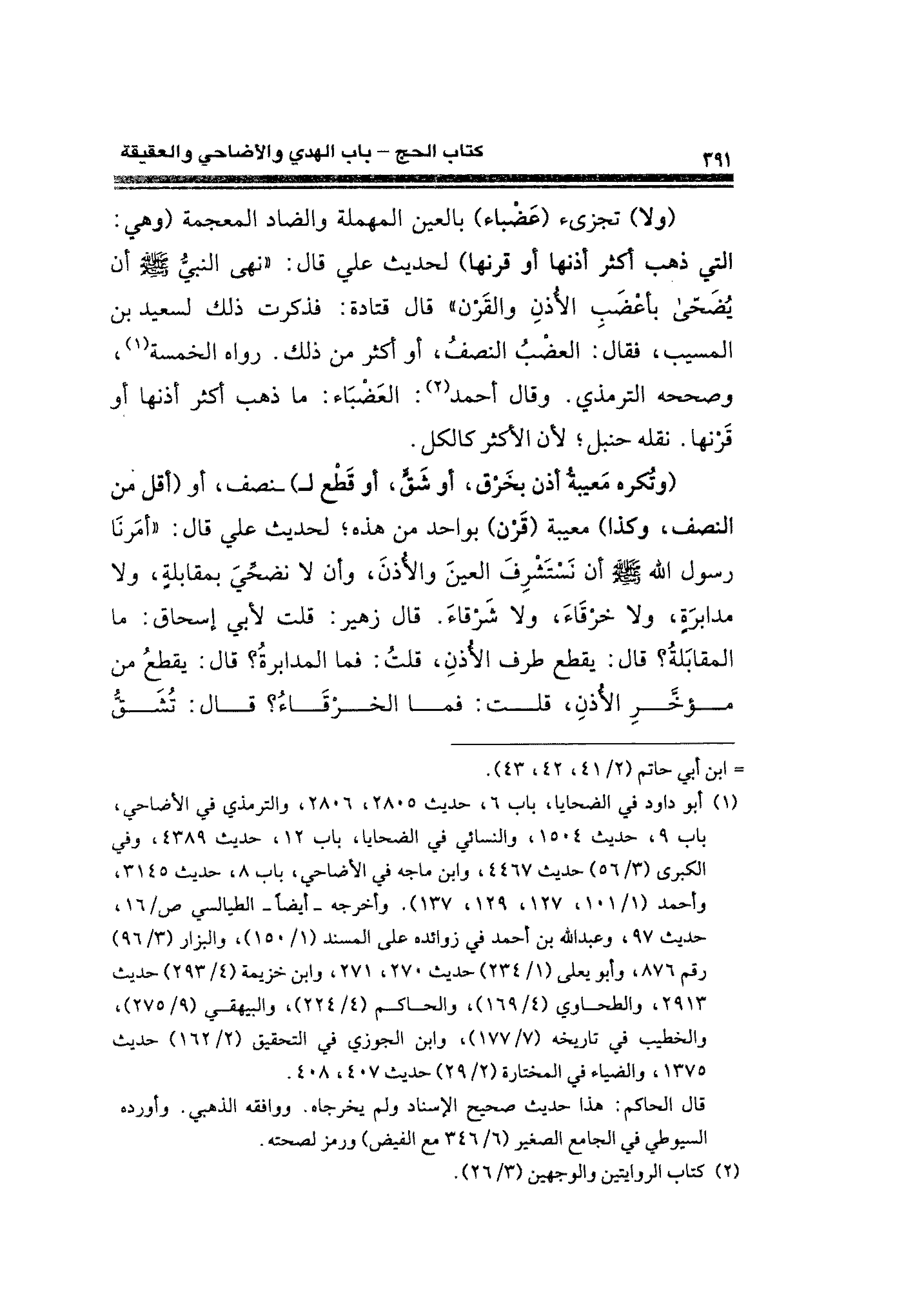 (ولا) تجزئ (عَضباء) بالعين المهملة والضاد المعجمة (وهي: التي ذهب أكثر أذتها أو قرنها) لحديث علي قال: "نهى النبيُّ - صلى الله عليه وسلم - أن يُضَحى بأعضَبِ الأذنِ والقَرن" قال قتادة: فذكرت ذلك لسعيد بن المسيب، فقال: العضْبُ النصفُ، أو أكثر من ذلك. رواه الخمسة (¬١)، وصححه الترمذي. وقال أحمد (¬٢): العَضبَاء: ما ذهب أكثر أذنها أو قَرنها. نقله حنبل؛ لأن الأكثر كالكل.