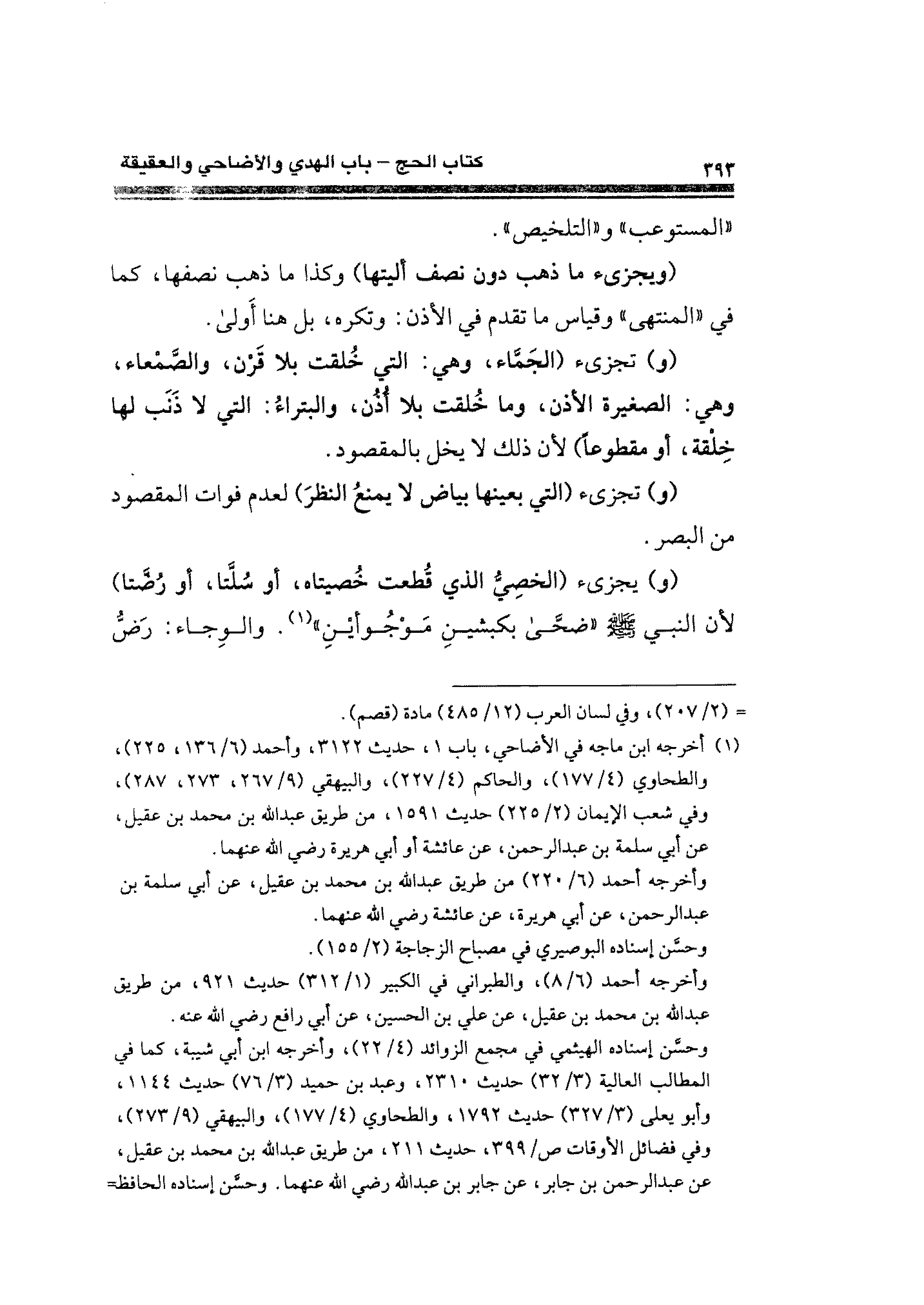 (و) تجزئ (الجَمَّاء، وهي: التي خُلقت بلا قَرن، والصَّمْعاء، وهي: الصغيرة الأذن، وما خُلقت بلا أذن، والبتراءُ: التي لا ذنب لها خِلْقة، أو مقطوعًا) لأن ذلك لا يخل بالمقصود.