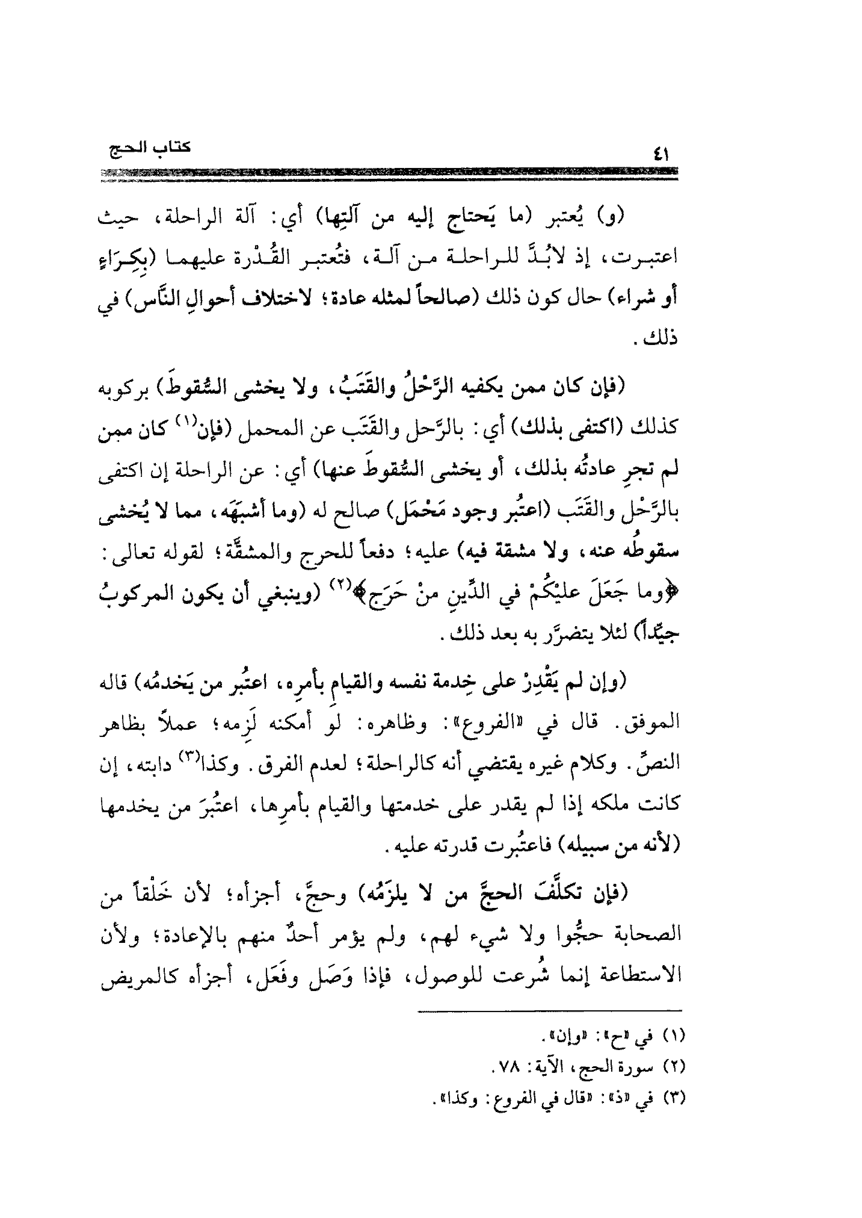 (وإن لم يَقْدِرْ على خِدمة نفسه والقيام بأمرِه، اعتُبر من يَخدمُه) قاله الموفق. قال في "الفروع": وظاهره: لو أمكنه لَزِمه؛ عملًا بظاهر النصِّ. وكلام غيره يقتضي إنه كالراحلة؛ لعدم الفرق. وكذا (¬٣) دابته، إن كانت ملكه إذا لم يقدر على خدمتها والقيام بأمرِها، اعتُبرَ من يخدمها (لأنه من سبيله) فاعتُبرت قدرته عليه.