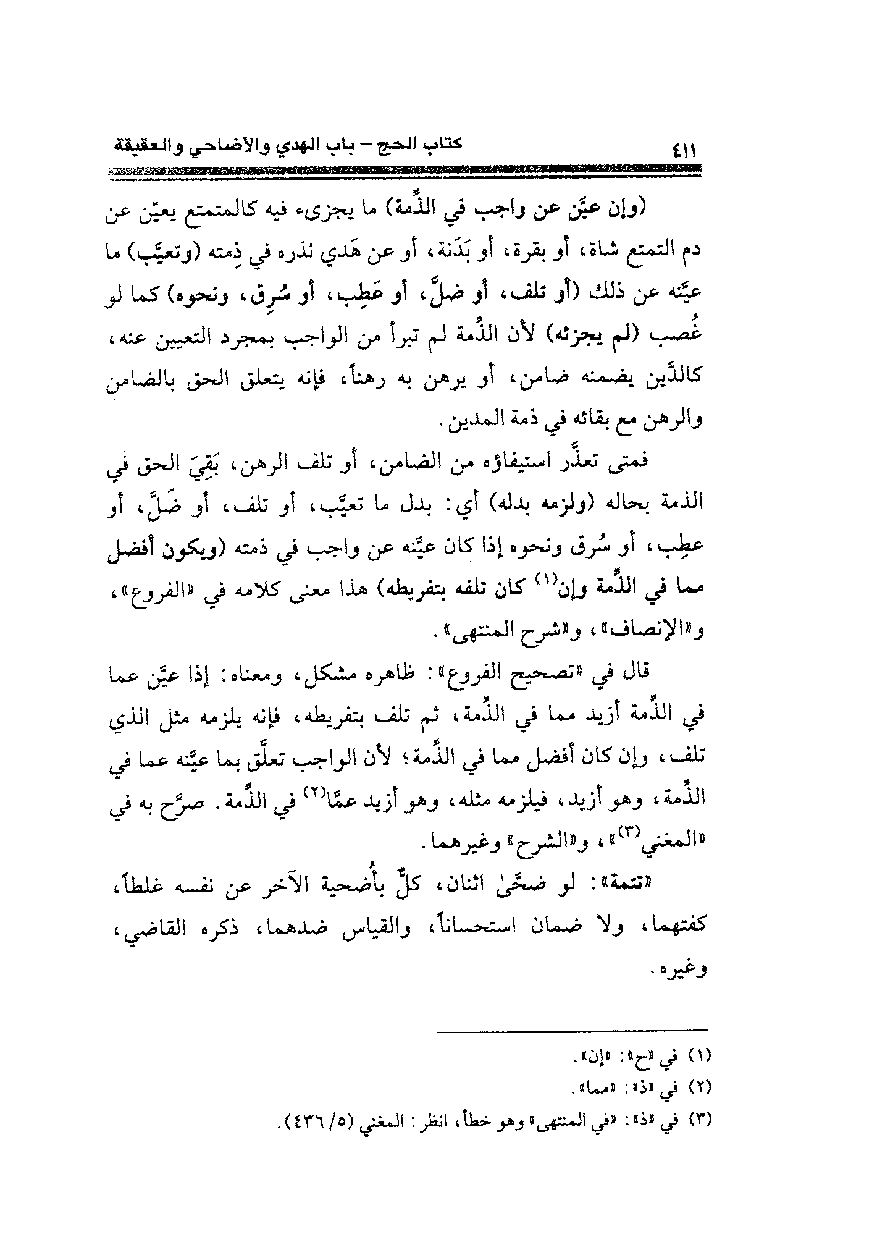 قال في "تصحيح الفروع": ظاهره مشكل، ومعناه: إذا عيَّن عما في الذمة أزيد مما في الذمة، ثم تلف بتفريطه، فإنه يلزمه مثل الذي تلف، وإن كان أفضل مما في الذِّمة؛ لأن الواجب تعلَّق بما عيَّنه عما في الذِّمة، وهو أزيد؛ فيلزمه مثله، وهو أزيد عما (¬٢) في الذمة. صرح به في "المغني (¬٣) "، و"الشرح" وغيرهما.