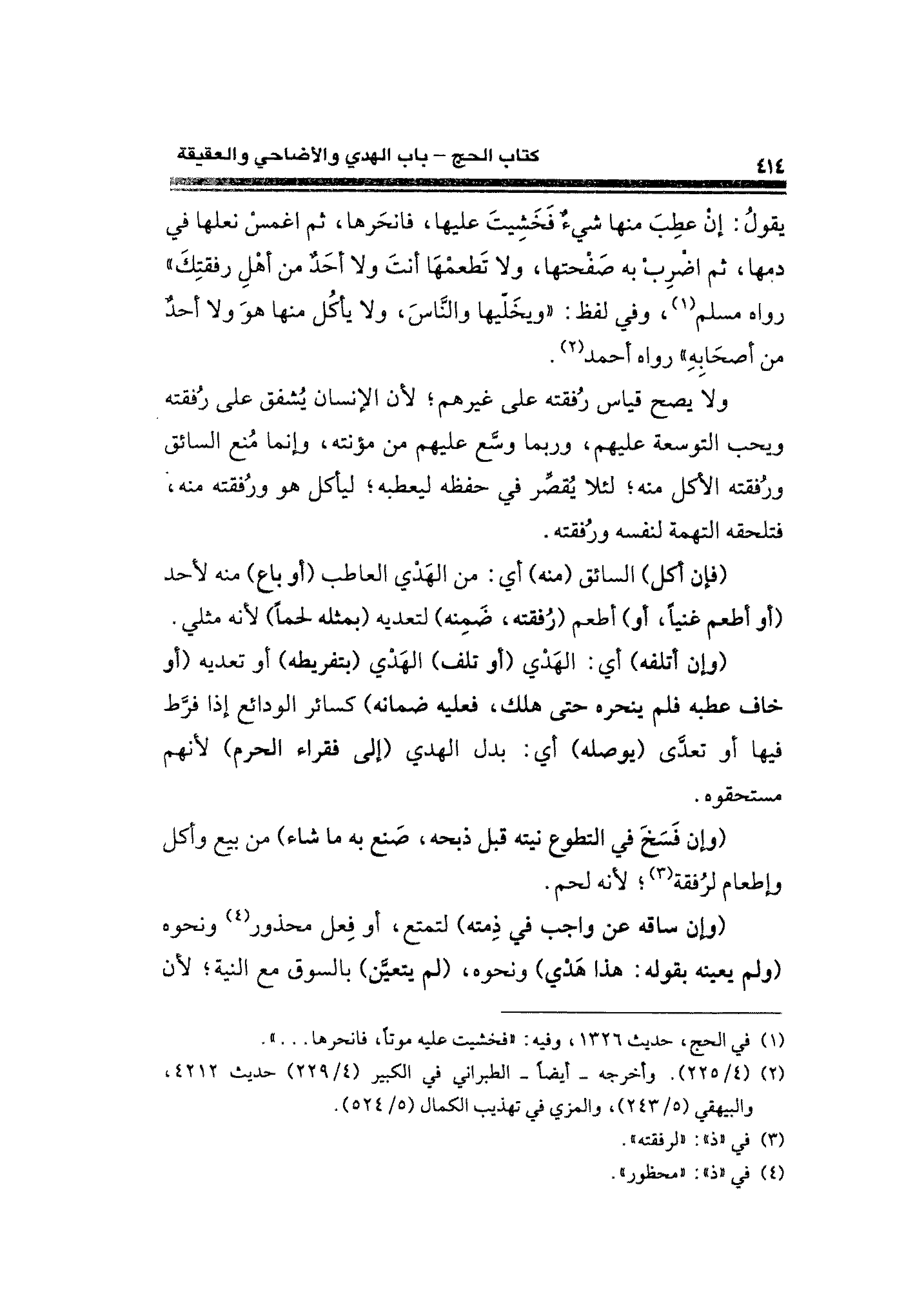 ولا يصح قياس رُفقته على غيرهم؛ لأن الإنسان يُشفق على رُفقته ويحب التوسعة عليهم، وربما وسَّع عليهم من مؤنته، وإنما مُنع السائق ورُفقته الأكل منه؛ لئلا يُقصِّر في حفظه ليعطبه؛ ليأكل هو ورُفقته منه، فتلحقه التهمة لنفسه ورُفقته.