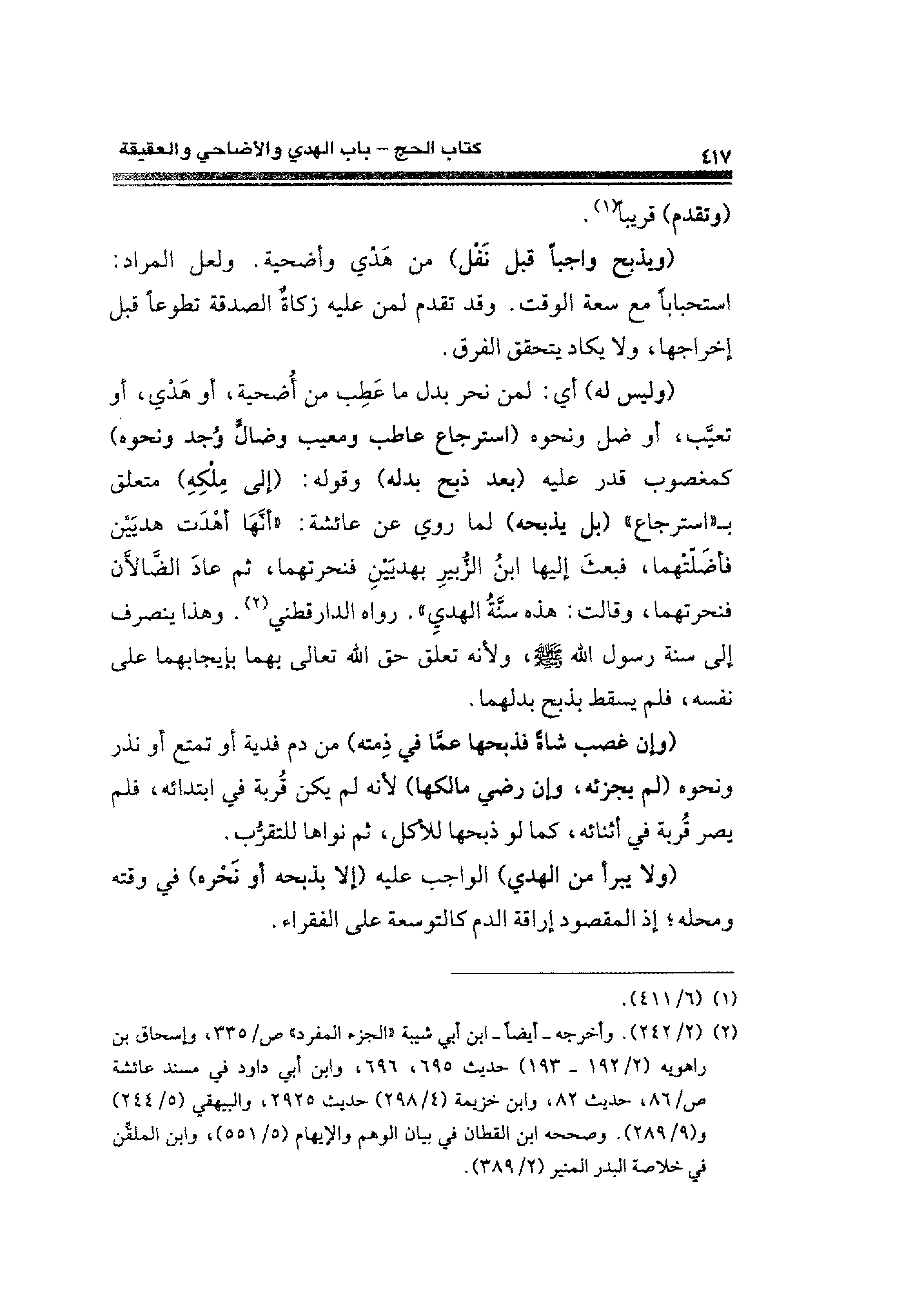 (وليس له) أي: لمن نحو بدل ما عَطِب من أُضحية، أو هَدْي، أو تعيَّب، أو ضل ونحوه (استرجاع عاطب ومعيب وضالٍّ وُجد ونحوه) كمغضوب قدر عليه (بعد ذبح بدله) وقوله: (أبي مِلكهِ) متعلق بـ "استرجاع" (بل يذبحه) لما روي عن عائشة: "أنهَا أهدَت هديَين فأضَلْتهما، فبعثَ إليها ابنُ الزبيرِ بهديين فنحرتهما، ثم عادَ الضالان فنحرتهما، وقالت: هذه سنة الهديِ". رواه الدارقطني (¬٢). وهذا ينصرف إلى سنة رسول - صلى الله عليه وسلم -، ولأنه تعلق حق أنه تعالى بهما بإجابهما على نفسه، فلم يسقط بذبح بدلهما.