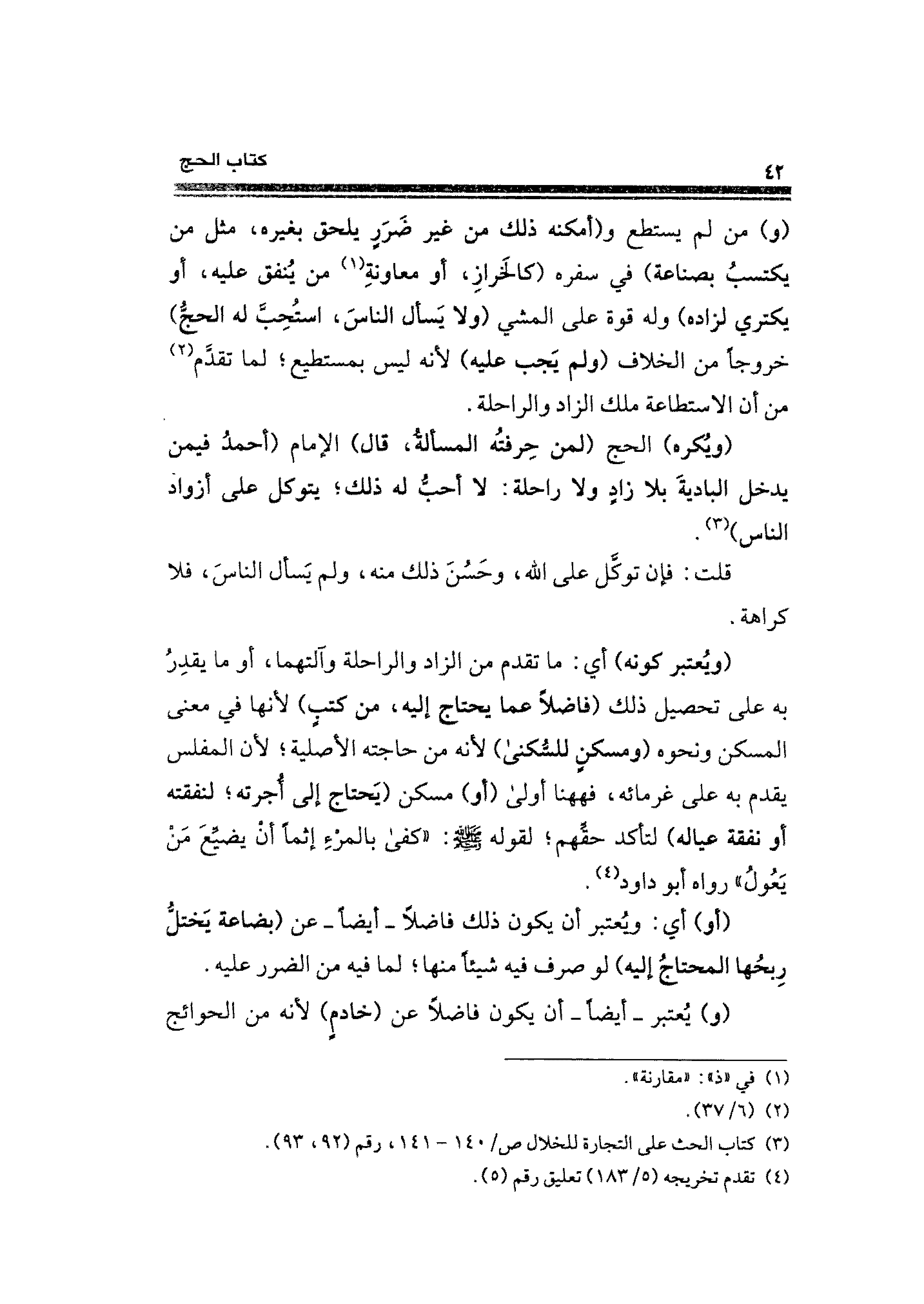 (ويُعتبر كونه) أي: ما تقدم من الزاد والراحلة وآلتهما، أو ما يقدِرُ به على تحصيل ذلك (فاضلًا عما يحتاج إليه؛ من كتبٍ) لأنها في معنى المسكن ونحوه (ومسكنٍ للسُّكنى) لأنه من حاجته الأصلية؛ لأن المفلس يقدم به على غرمائه، فههنا أولى (أو) مسكن (يَحتاج إلى أُجرته؛ لنفقته أو نفقة عياله) لتأكد حقِّهم؛ لقوله - صلى الله عليه وسلم -: "كفى بالمرْءِ إثمًا إنْ يضيِّعَ مَنْ يَعُولُ" رواه أبو داود (¬٤).