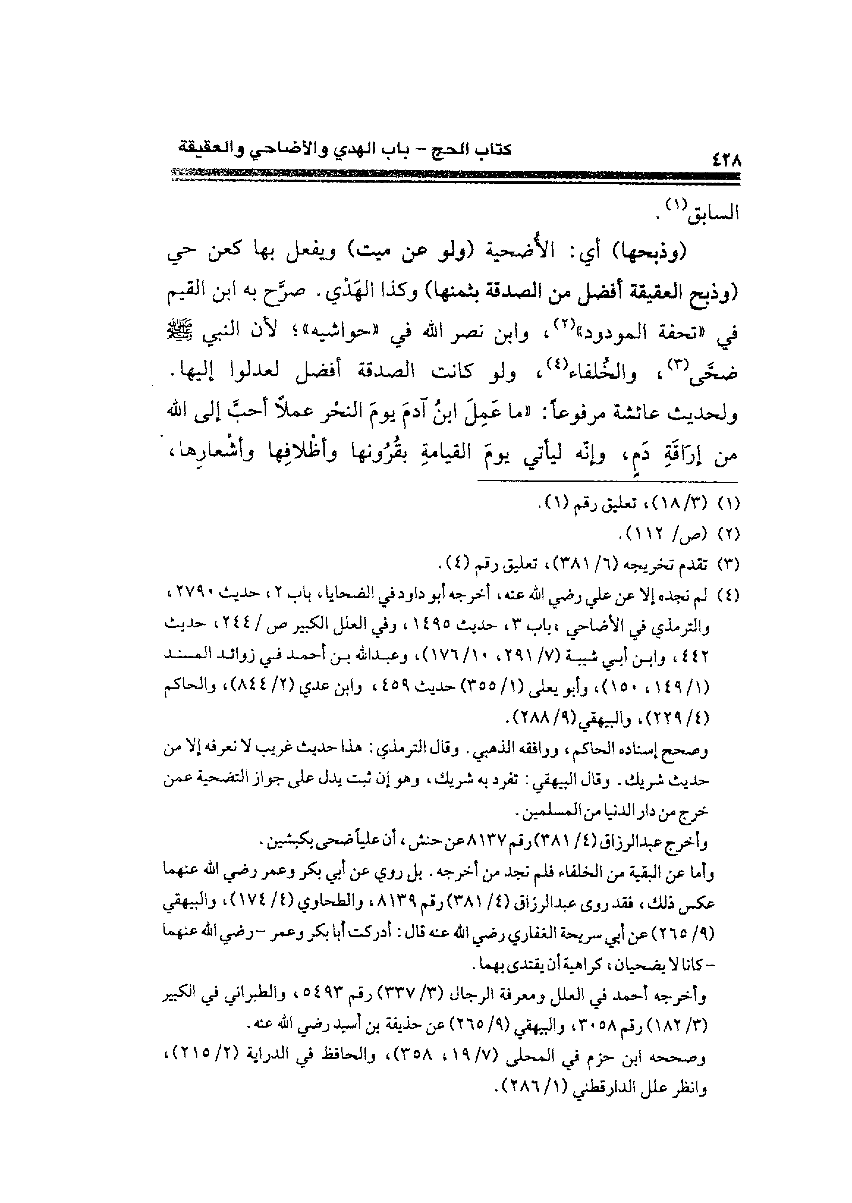 (وذبحها) أي: الأُضحية (ولو عن ميت) ويفعل بها كعن حي (وذبح العقيقة أفضل من الصدقة بثمنها) وكذا الهدي. صرَّح به ابن القيِّم في "تحفة المودود" (¬٢)، وابن نصر الله في "حواشيه"؛ لأنَّ النَّبيّ - صلى الله عليه وسلم - ضحَّى (¬٣)، والخُلفاء (¬٤)، ولو كانت الصدقة أفضل لعدلوا إليها. ولحديث عائشة مرفوعًا: "ما عَمِلَ ابنُ آدمَ يومَ النحْر عملًا أحبَّ إلى الله من إراقَةِ دَمِ، وإنَّه ليأتي يومَ القيامةِ بقُرُونها وأظْلافِها وأشْعارِها،
