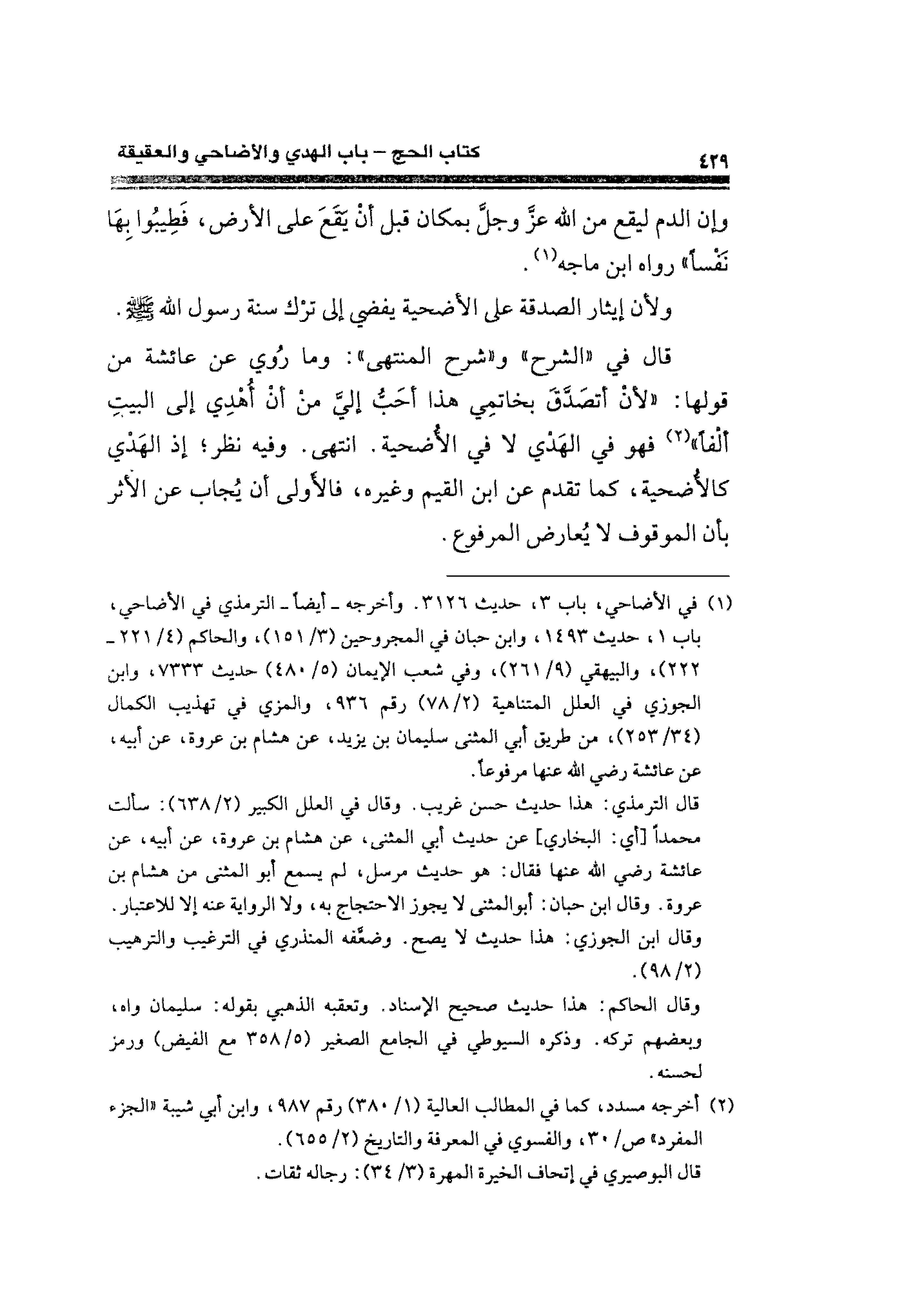 قال في "الشرح" و "شرح المنتهى": وما رُوي عن عائشة من قولها: "لأن أتصَدَّقَ بخاتمِي هذا أحَبُّ إليَّ من أن أُهدِي إلى البيت ألفًا" (¬٢) فهو في الهَدي لا في الأُضحية. انتهى. وفيه نظر؛ إذ الهدي كالأضحية، كما تقدم عن ابن القيِّم وغيره، فالأولى أن يُجاب عن الأثر بأن الموقوف لا يُعارض المرفوع.