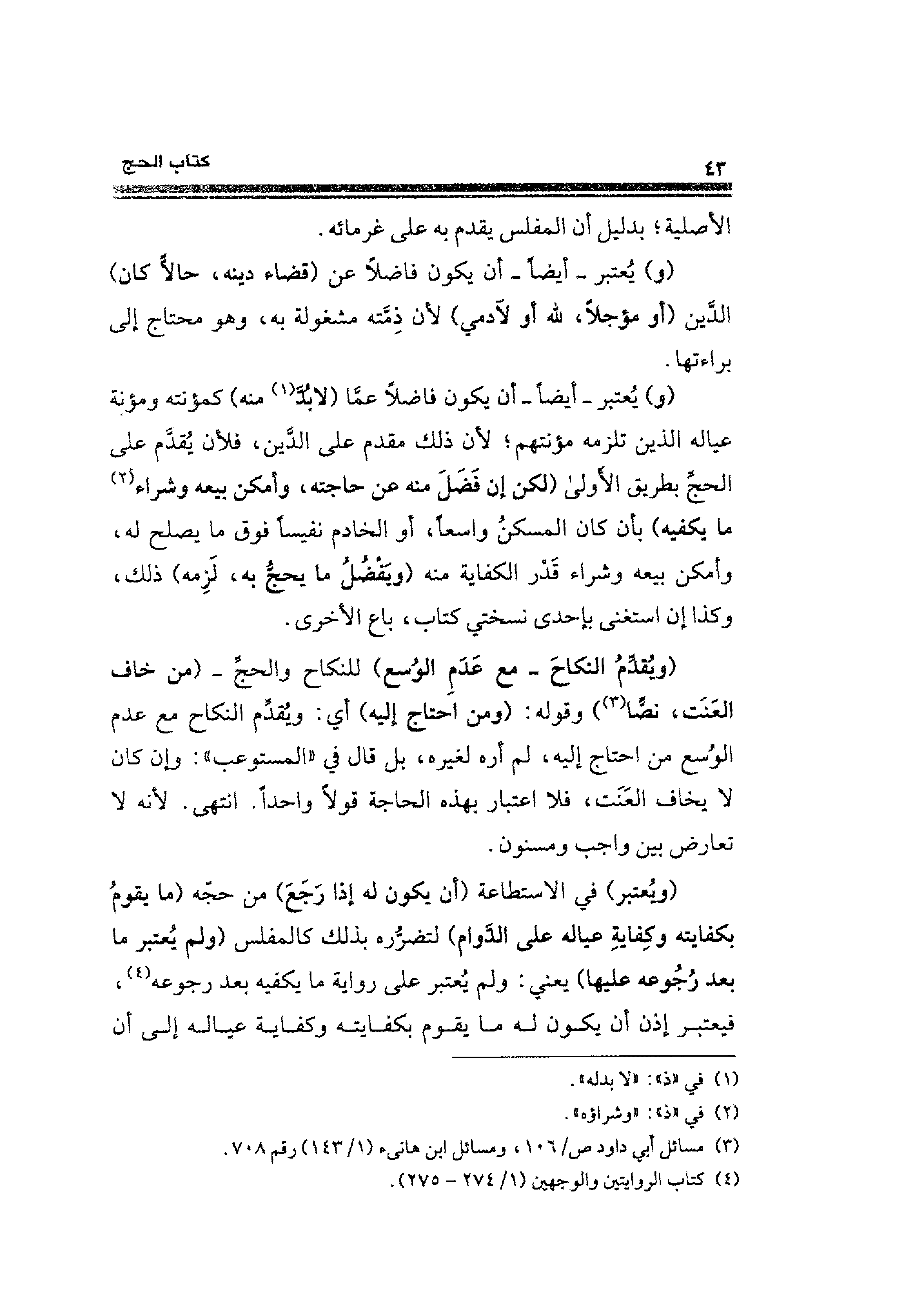 (ويُعتبر) في الاستطاعة (أن يكون له إذا رَجَعَ) من حجّه (ما يقومُ بكفايته وكِفايةِ عياله على الدَّوام) لتضرُّره بذلك كالمفلس (ولم يُعتبر ما بعد رُجُوعه عليها) يعتي: ولم يُعتبر على رواية ما يكفيه بعد رجوعه (¬٤)، فيعتبر إذن أن يكون له ما يقوم بكفايته وكفاية عياله إلى أن