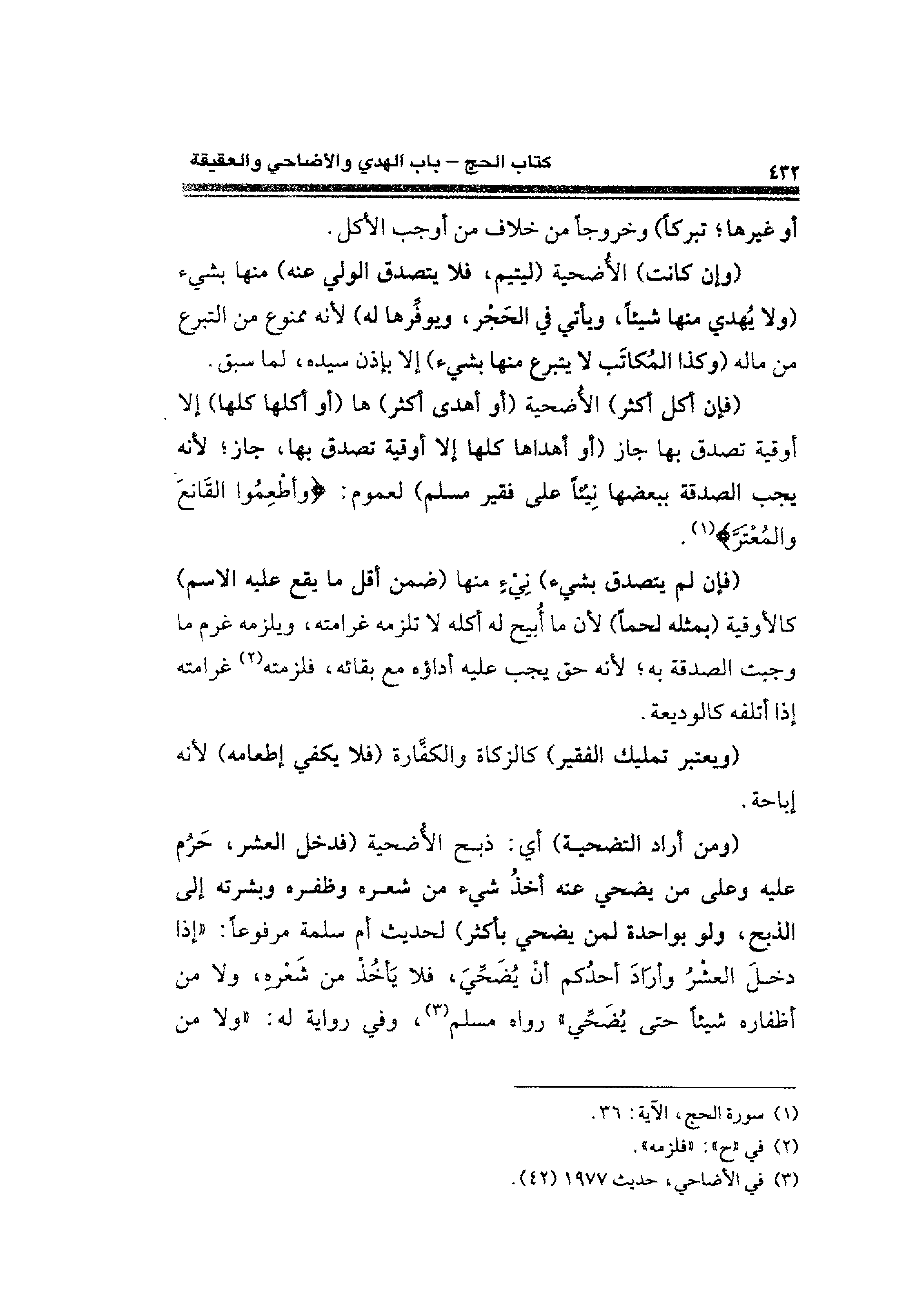 (ومن أراد التضحية) أي: ذبح الأضحية (فدخل العشر، حَرُم عليه وعلي من يضحي عنه أخذُ شيء من شعره وظفره وبشرته إلى الذبح، ولو بواحدة لمن يضحي بأكثر) لحديث أم سلمة مرفوعًا: "إذا دخلَ العشْرُ وأرَادَ أحدُكم أنْ يُضَحَّيَ، فلا يَأخُذْ من شَعْرِه، ولا من أظفاره شيئًا حتى يُضَحِّي" رواه مسلم (¬٣)، وفي رواية له: "ولا من