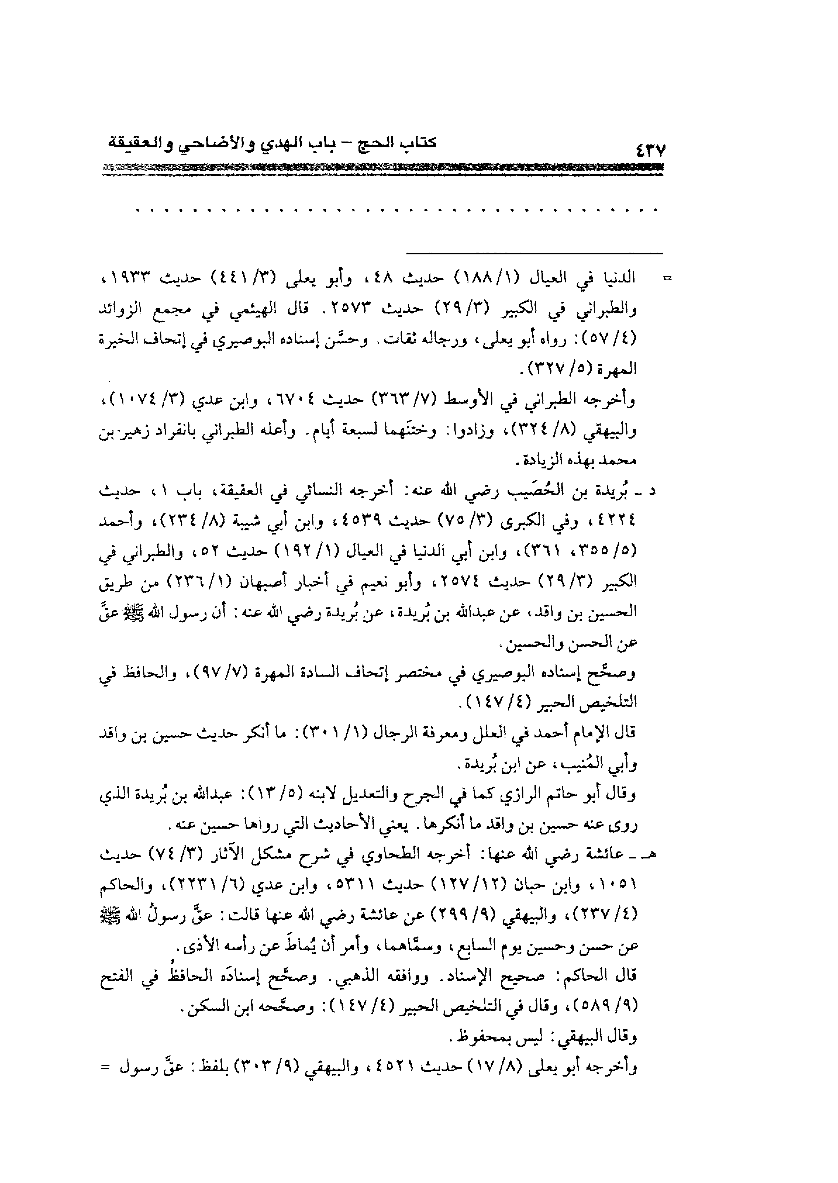 هـ- عائشة رضي الله عنها: أخرجه الطحاوي في شرح مشكل الآثار (٣/ ٧٤) حديث ١٠٥١، وابن حبان (١٢/ ١٢٧) حديث ٥٣١١، وابن عدي (٦/ ٢٢٣١)، والحاكم (٤/ ٢٣٧)، والبيهقي (٩/ ٢٩٩) عن عائشة رضي الله عنها قالت: عقَّ رسولُ الله - صلى الله عليه وسلم - عن حسن وحسين يوم السابع، وسمَّاهما، وأمر أن يُماطَ عن رأسه الأذى.