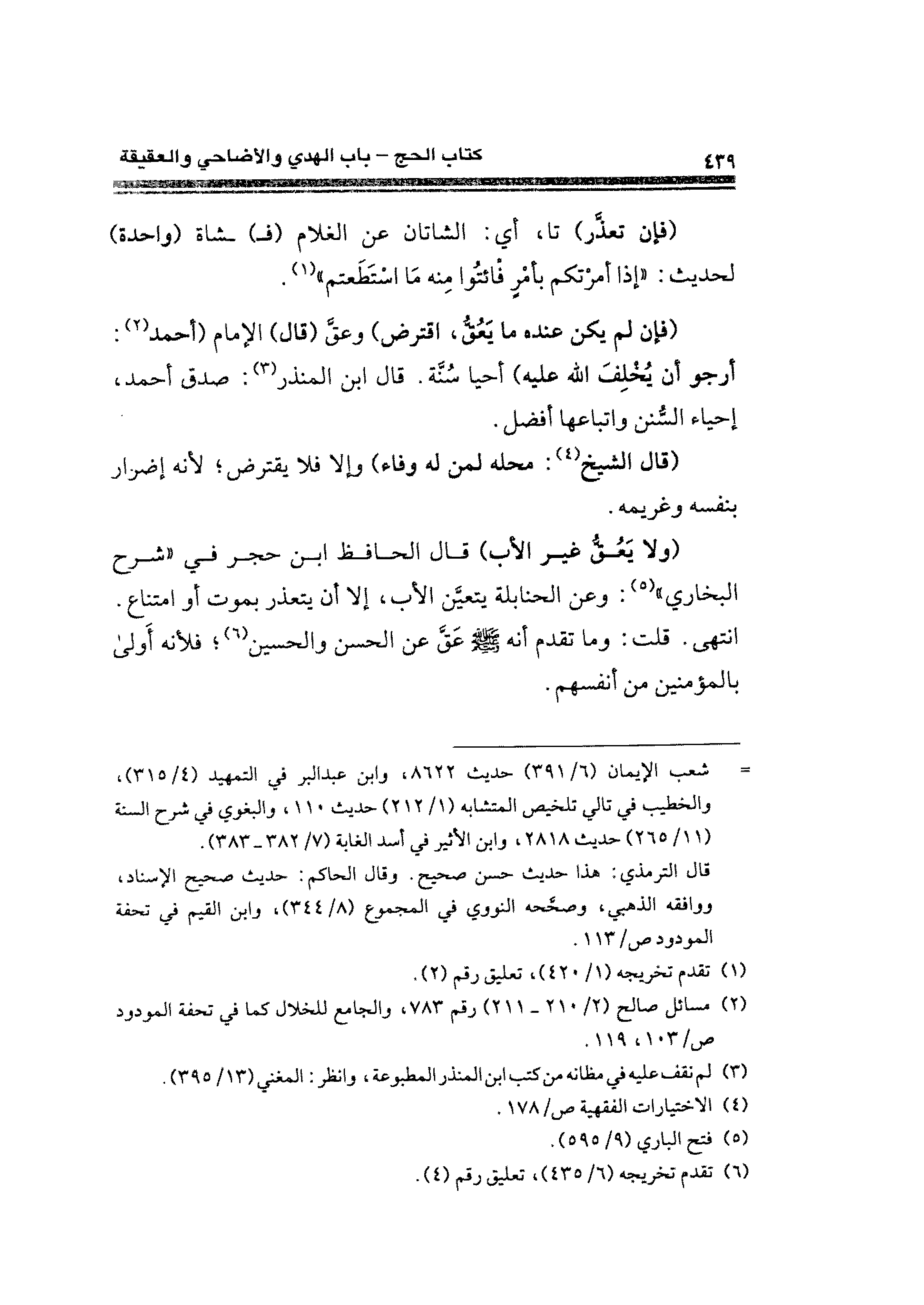 (فإن لم يكن عنده ما يَعُقُّ، اقترض) وعقَّ (قال) الإمام (أحمد (¬٢): أرجو أن يُحلِفَ الله عليه) أحيا سُنَّة. قال ابن المنذر (¬٣): صدق أحمد، إحياء السُّنن واتباعها أفضل.