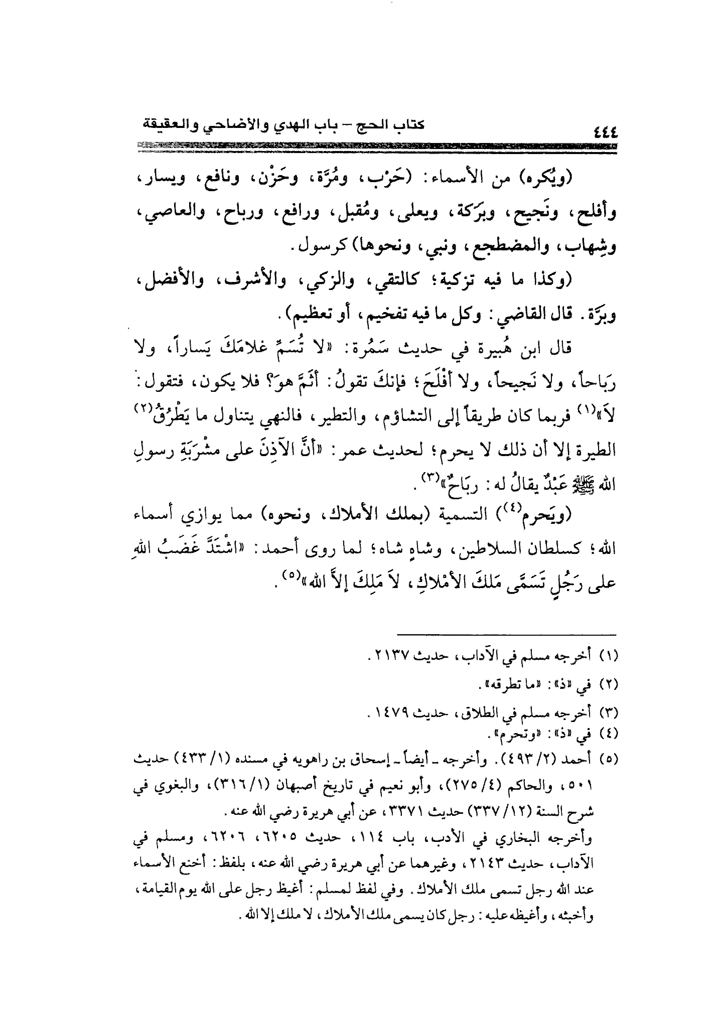 (ويُكره) من الأسماء: (حَرْب، ومُرَّة، وحَزْن، ونافع، ويسار، وأفلح، ونَجيح، وبَرَكة، ويعلى، ومُقبل، ورافع، ورباح، والعاصي، وشِهاب، والمضطجع، ونبي، ونحوها) كرسول.