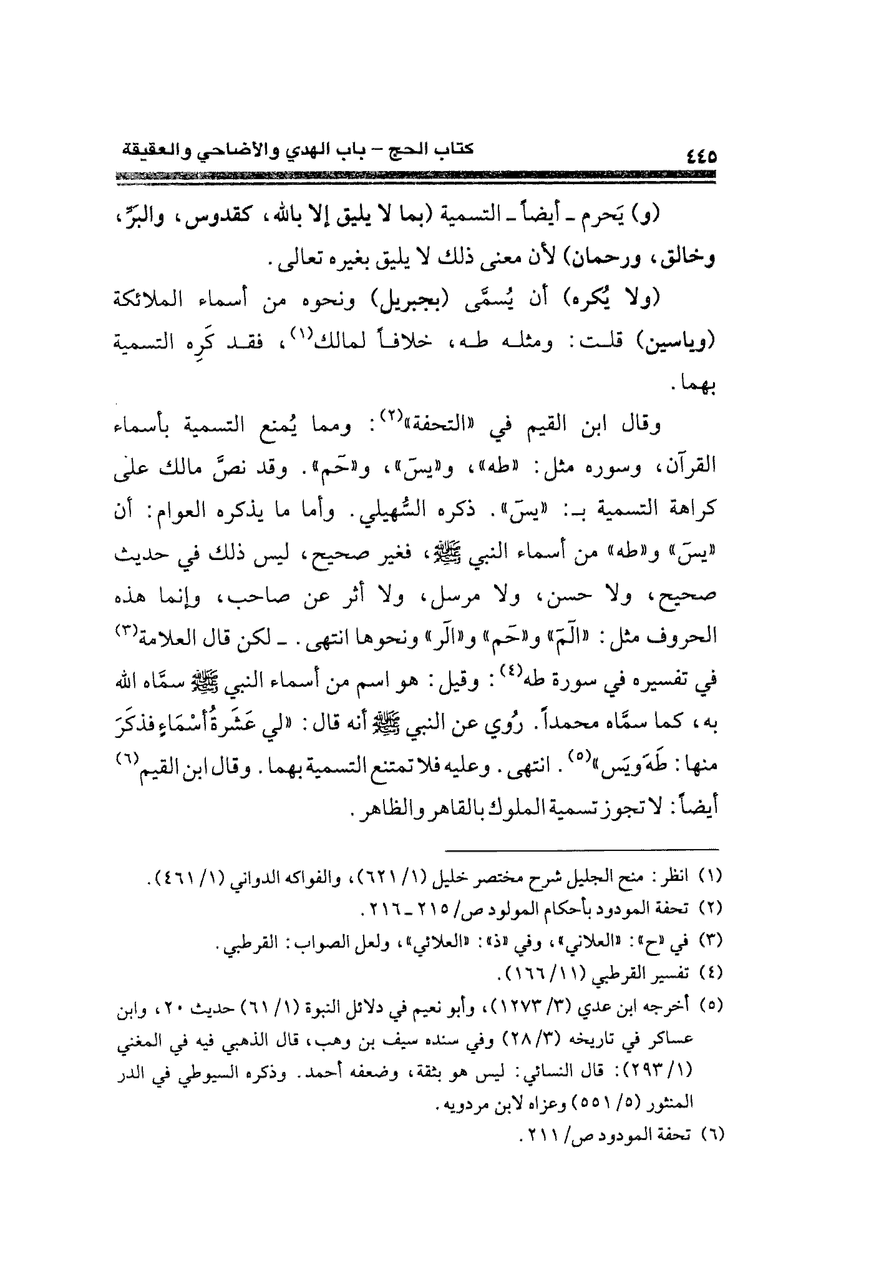 وقال ابن القيم في "التحفة" (¬٢): ومما يُمنع التسمية بأسماء القرآن، وسوره مثل: "طه"، و"يس"، و"حَم". وقد نصَّ مالك على كراهة التسمية بـ "يس". ذكره السُّهيلي. وأما ما يذكره العوام: أن "يس" و"طه" من أسماء النبي - صلى الله عليه وسلم -، فغير صحيح، ليس ذلك في حديث صحيح، ولا حسن، ولا مرسل، ولا أثر عن صاحب، وإنما هذه هذه الحروف مثل: "المَ" و"حَم" و"الر" ونحوها انتهى. -لكن قال العلامة (¬٣) في تفسيره في سورة طه (¬٤): وقيل: هو اسم من أسماء النبي سمَّاه الله به كما سمَّاه محمدًا. رُوي عن النبي - صلى الله عليه وسلم - أنَّه قال: "لي عَشَرةُ أسمَاءٍ فذكَرَ منها: طَهَ ويَس" (¬٥). انتهى. وعليه فلا تمتنع التسمية بهما. وقال ابن القيم (¬٦) أيضًا: لا تجوز تسمية الملوك بالقاهر والظاهر.