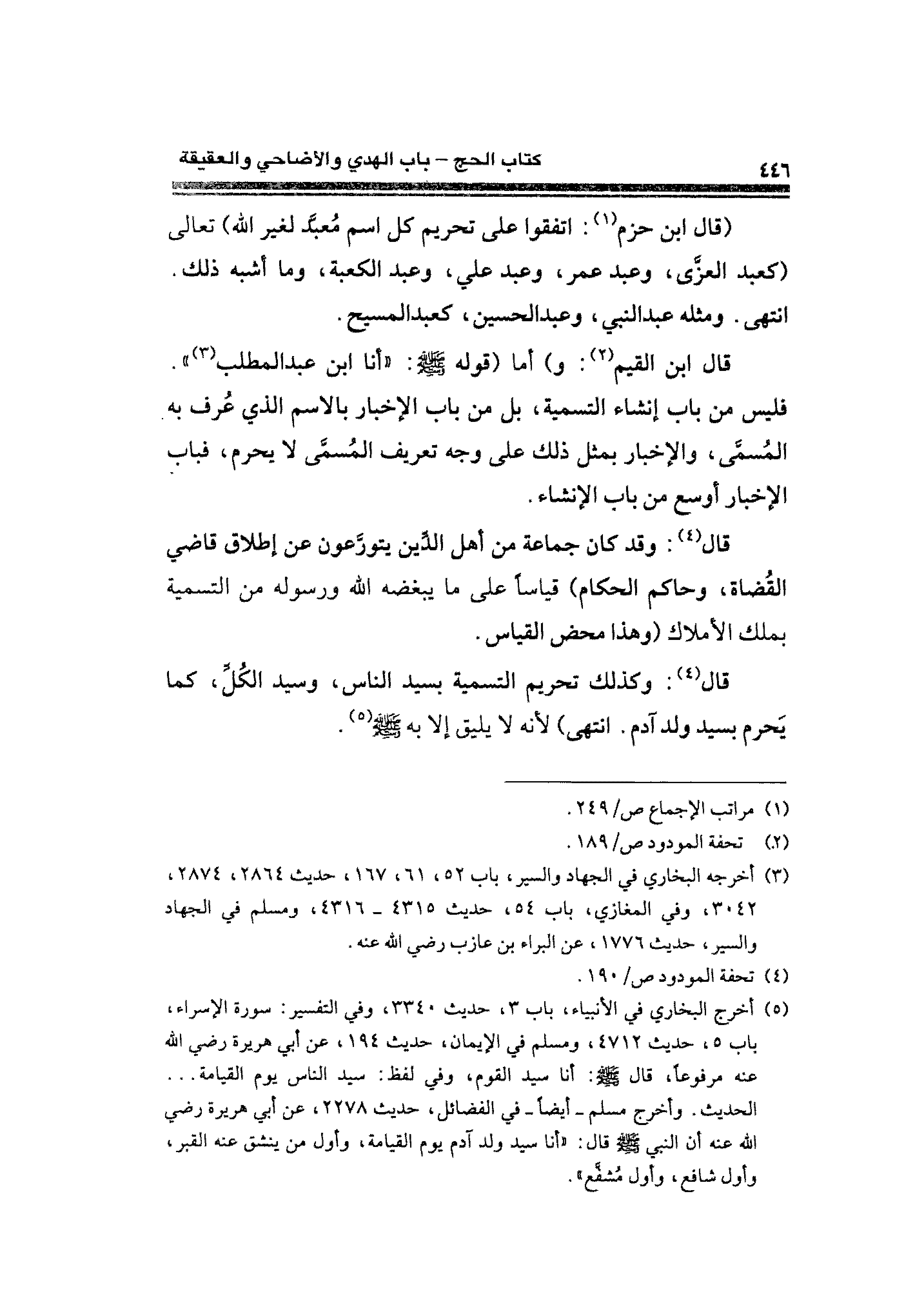 قال ابن القيم (¬٢): و) أما (قوله - صلى الله عليه وسلم -: "أنا ابن عبد المطلب (¬٣) ". فليس من باب إنشاء التسمية، بل من باب الإخبار بالاسم الَّذي عُرف به. المُسمَّى، والإخبار بمثل ذلك على وجه تعريف المُسمَّى لا يحرم، فباب الإخبار أوسع من باب الإنشاء.