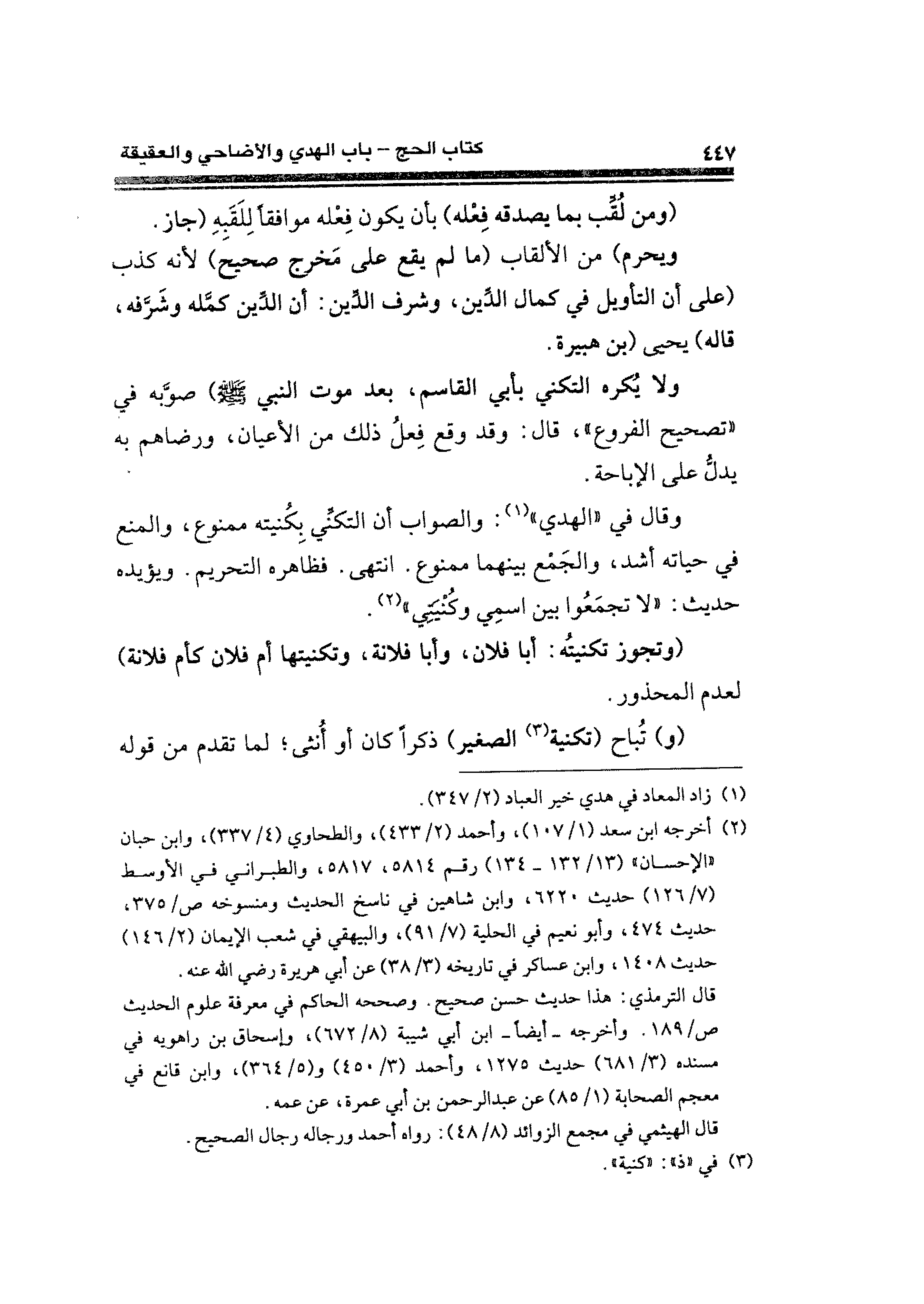 ولا يكره التكني بأبي القاسم، بعد موت النبي - صلى الله عليه وسلم -) صوَّبه في "تصحيح الفروع"، قال: وقد وقع فِعلُ ذلك من الأعيان، ورضاهم به يدلُّ على الإباحة.
