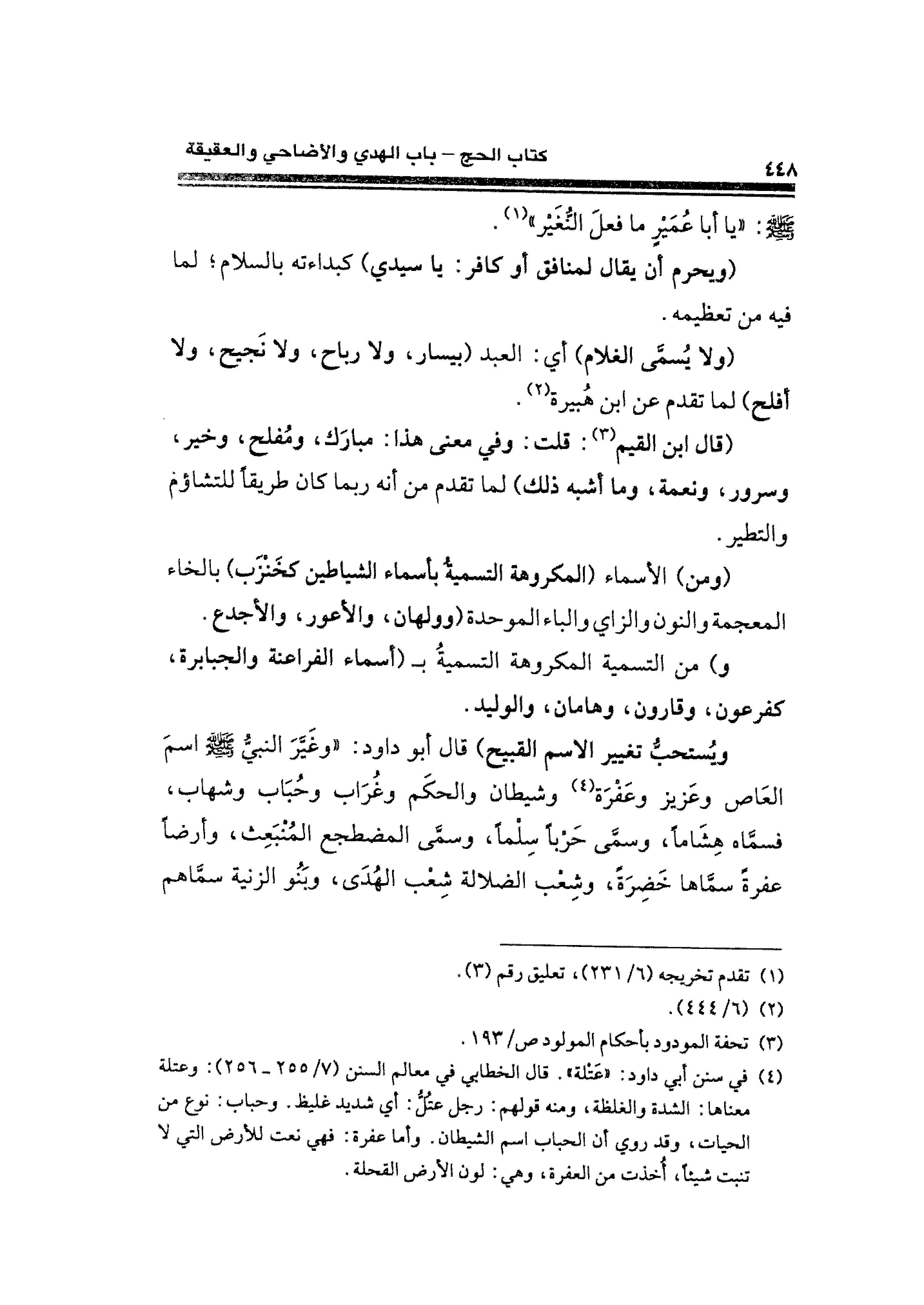 ويُستحبُّ تغيير الاسم القبيح) قال أبو داود: "وغَيَّرَ النبيُّ - صلى الله عليه وسلم - اسمَ العَاص وعَزيز وعَفْرَة (¬٤) وشيطان والحكَم وغُرَاب وحُبَاب وشهاب، فسمَّاه هِشَامًا، وسمَّى حَرْبًا سِلْمًا، وسمَّى المضطجع المُنْبَعِث، وأرضًا عفرةً سمَّاها خَضِرَةً، وشِعْب الضلالة شِعْب الهُدَى، وَبنُو الزنية سمَّاهم