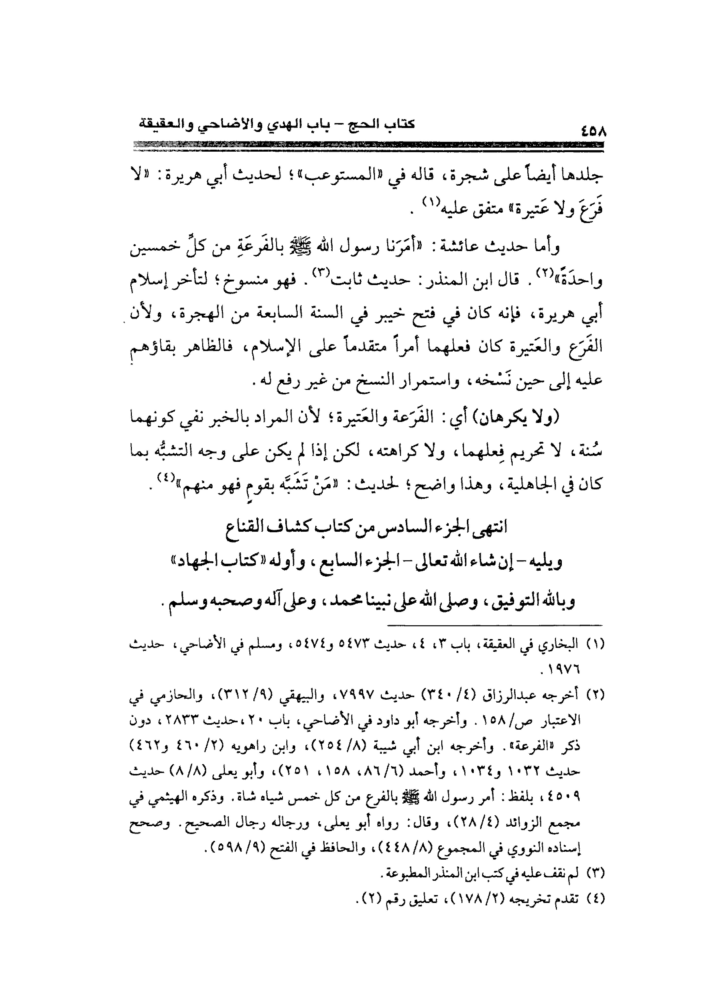 (ولا يكرهان) أي: الفَرَعة والعَتيرة؛ لأن المراد بالخبر نفي كونهما سنة، لا تحريم فِعلهما، ولا كراهته، لكن إذا لم يكن على وجه التشبُّه بما كان في الجاهلية، وهذا واضح؛ لحديث: "مَنْ تَشَبَّه بقومٍ فهو منهم" (¬٤).