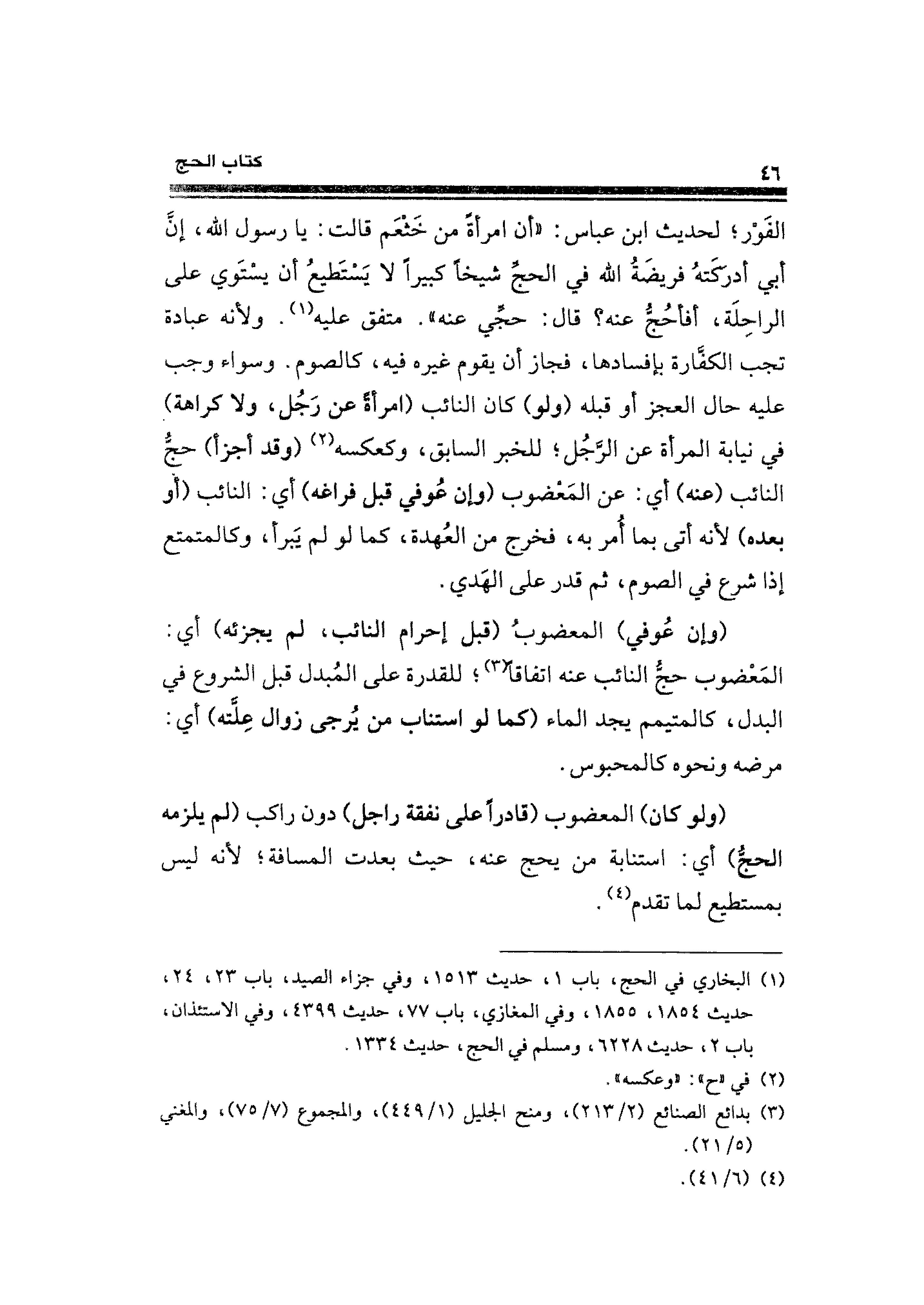 الفَوْر؛ لحديث ابن عباس: "أن امرأةً من خَثْعَم قالت: يا رسول الله، إنَّ أبي أدركَتهُ فريضَةُ الله في الحجِّ شيخًا كبيرًا لا يَسْتَطيعُ أن يسْتَوي على الراحِلَة، أفأحُجُّ عنه؟ قال: حجِّي عنه". متفق عليه (¬١). ولأنه عبادة تجب الكفَّارة بإفسادها، فجاز أن يقوم غيره فيه، كالصوم. وسواء وجب عليه حال العجز أو قبله (ولو) كان النائب (امرأةً عن رَجُل، ولا كراهة) في نيابة المرأة عن الرَّجُل؛ للخبر السابق، وكعكسه (¬٢) (وقد أجزأ) حجُّ النائب (عنه) أي: عن المَغضوب (وإن عُوفي قبل فراغه) أي: النائب (أو بعده) لأنه أتى بما أُمر به، فخرج من العُهدة، كما لو لم يَبرأ، وكالمتمتع إذا شرع في الصوم، ثم قدر على الهَدي.