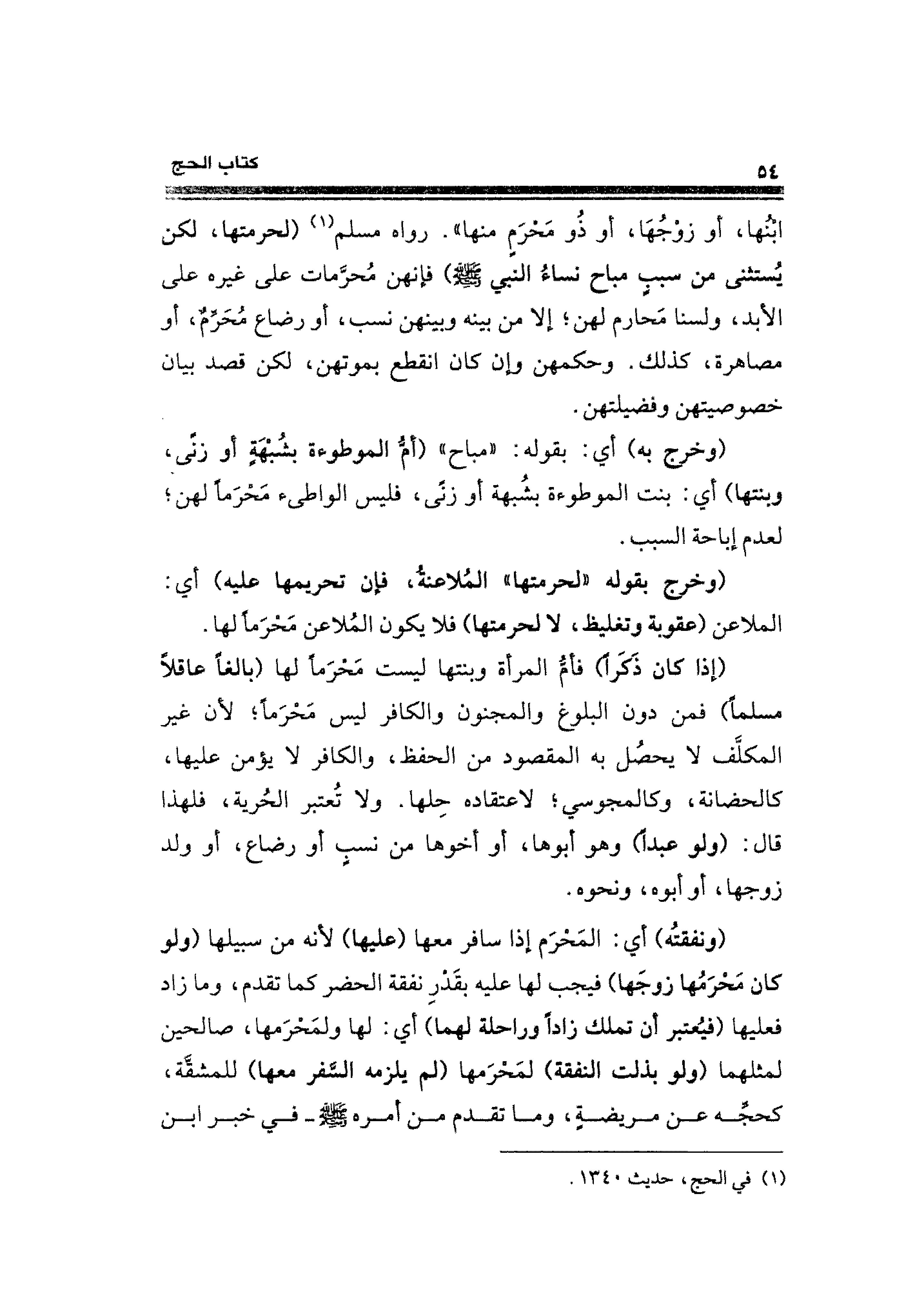 ابنُها، أو زوْجُهَا، أو ذو مَحرَمٍ منها". رواه مسلم (¬١) (لحرمتها، لكن يُستثنى من سببٍ مباح نساءُ النبي - صلى الله عليه وسلم -) فإنهن مُحرمات على غيره على الأبد، ولسنا مَحارم لهن؛ إلا من بينه وبينهن نسب، أو رضاع مُحَرِّمٌ، أو مصاهرة، كذلك. وحكمهن وإن كان انقطع بموتهن، لكن قصد بيان خصوصيتهن وفضيلتهن.