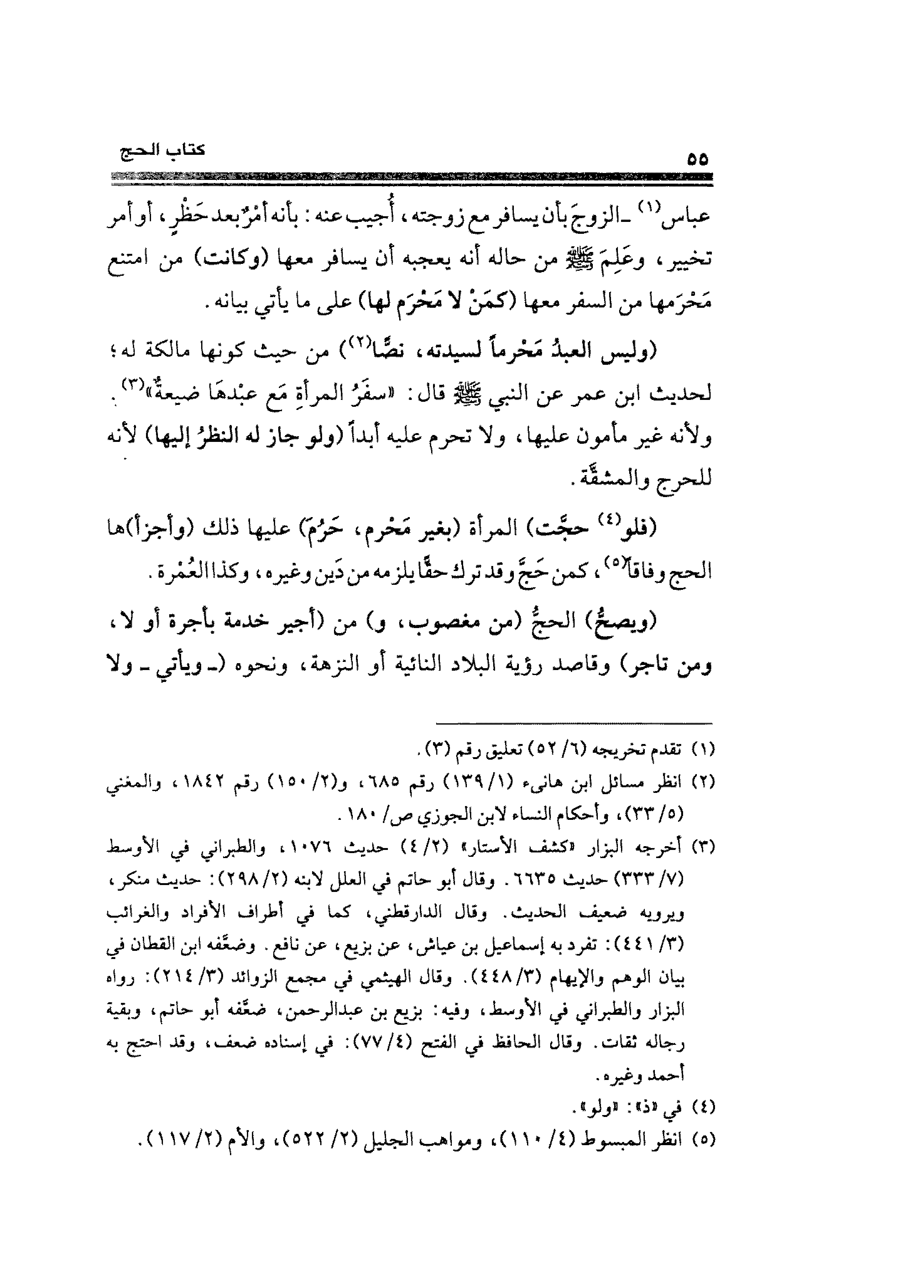 عباس (¬١) -الزوجَ بأن يسافر مع زوجته، أُجيب عنه: بأنه أمْرٌ بعد حَظْرٍ، أو أمر تخيير، وعَلِمَ - صلى الله عليه وسلم - من حاله أنه يعجبه أن يسافر معها (وكانت) من امتنع مَحرَمها من السفر معها (كمَن لامَحرَم لها) على ما يأتي بيانه.