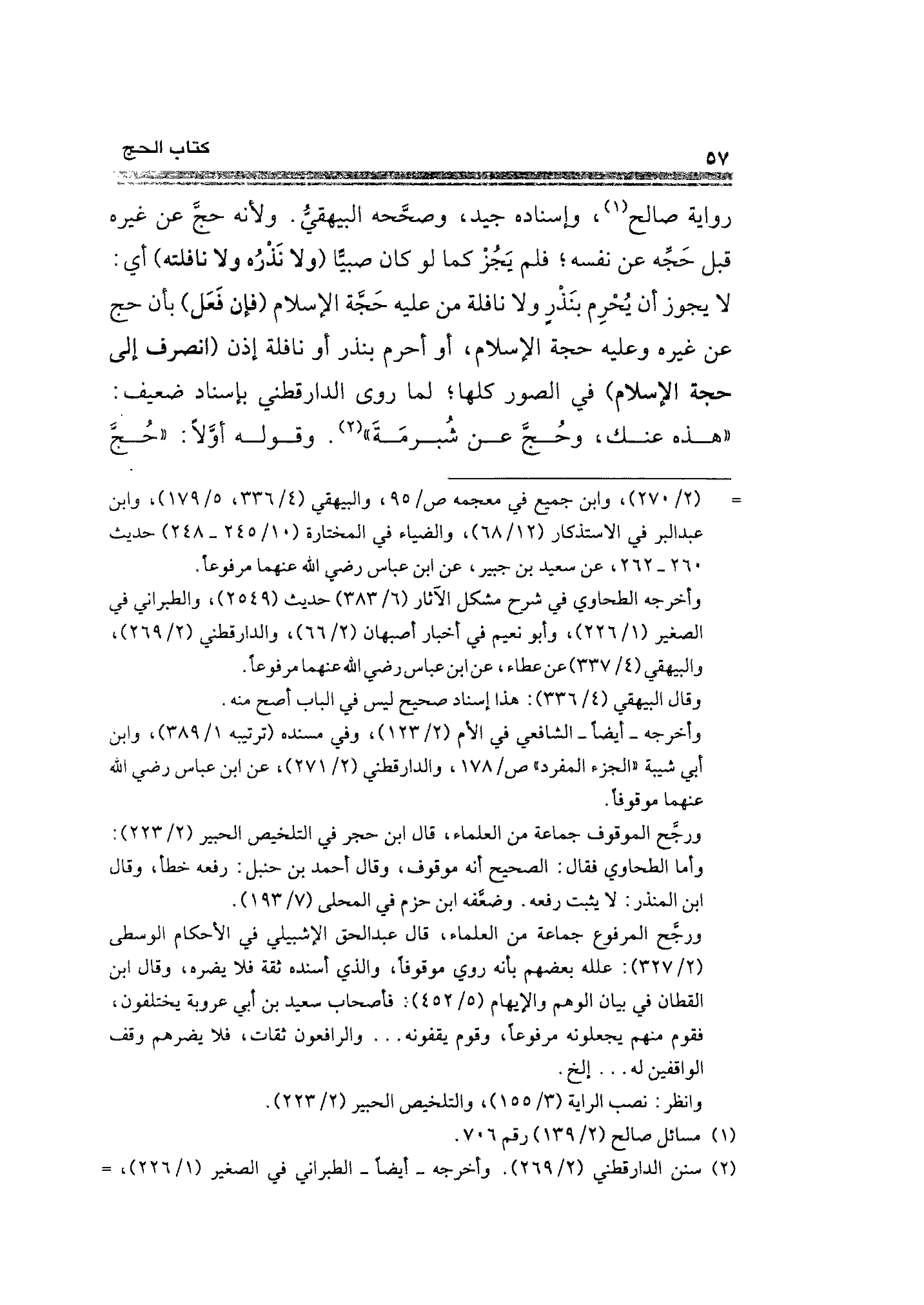 رواية صالح (¬١)، وإسناده جيد، وصحَّحه البيهقي. ولأنه حج عن غيره قبل حَجِّه عن نفسه؛ فلم يَجُزْ كما لو كان صبيًّا (ولا نَذرُه ولا نافلته) أي: لا يجوز أن يُحرِم بنَذرٍ ولا نافلة من عليه حَجَّة الإسلام (فإن فَعَل) بأن حج عن غيره وعليه حجة الإسلام، أو أحرم بنذر أو نافلة إذن (انصرف إلى حجة الإسلام) في الصور كلها؛ لما روى الدارقطني بإسناد ضعيف: "هذه عنك، وحُجَّ عن شُبرمَةَ" (¬٢). وقوله أولًا: "حُجَّ