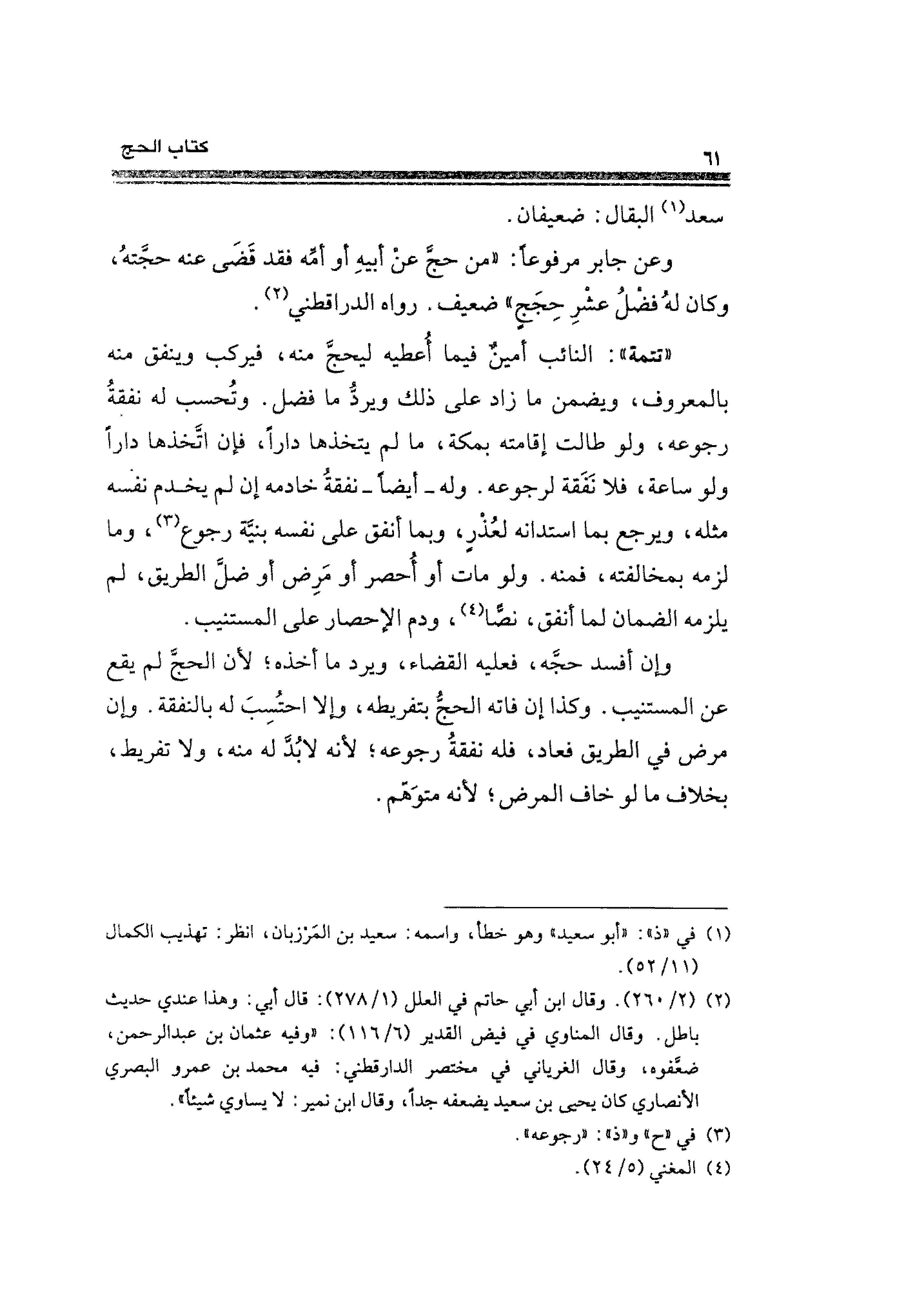 وعن جابر مرفوعًا: "من حجَّ عنْ أبيهِ أو أمِّه فقد قَضَى عنه حجتهُ، وكان لهُ فضلُ عشرِ حِجَجٍ" ضعيف. رواه الدراقطني (¬٢).