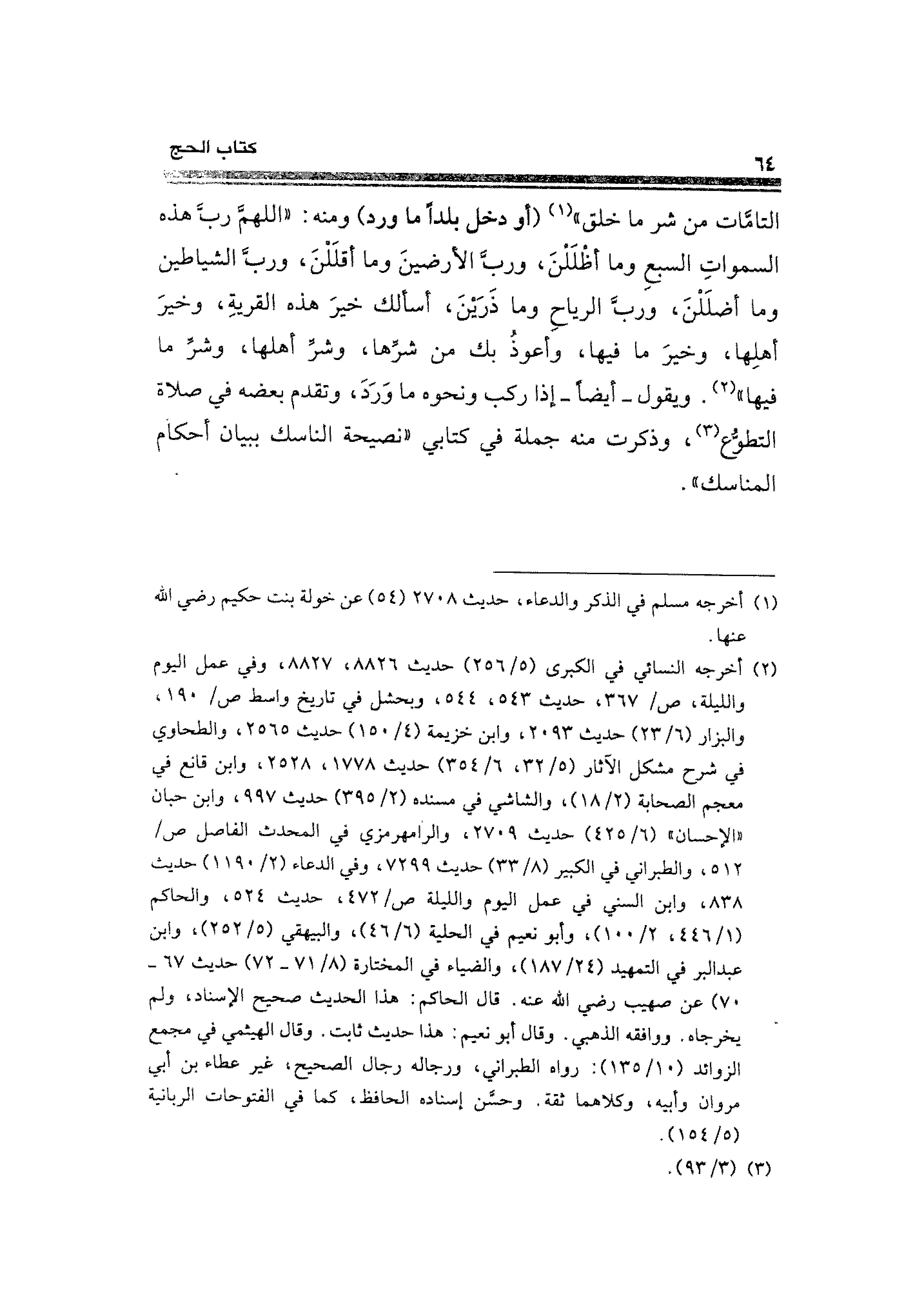 التامَّات من شر ما خلق" (¬١) (أو دخل بلدًا ما ررد) ومنه: "اللهمَّ رب هذه السمواتِ السبعِ وما أظلَلنَ، وربَّ الأرضينَ وما أقلَلنَ، وربَّ الشياطين وما أضلَلْنَ، وربَّ الرياح وما ذَرَينَ، أسألك خيرَ هذه القريةِ، وخيرَ أهلِها، وخيرَ ما فيها، وأعوذُ بك من شرِّها، وشرِّ أهلها، وشرِّ ما فيها" (¬٢). ويقول -أيضًا- إذا ركب ونحوه ما ورَدَ، وتقدم بعضه في صلاة التطوُّعِ (¬٣)، وذكرت منه جملة في كتابي "نصيحة الناسك ببيان أحكام المناسك".