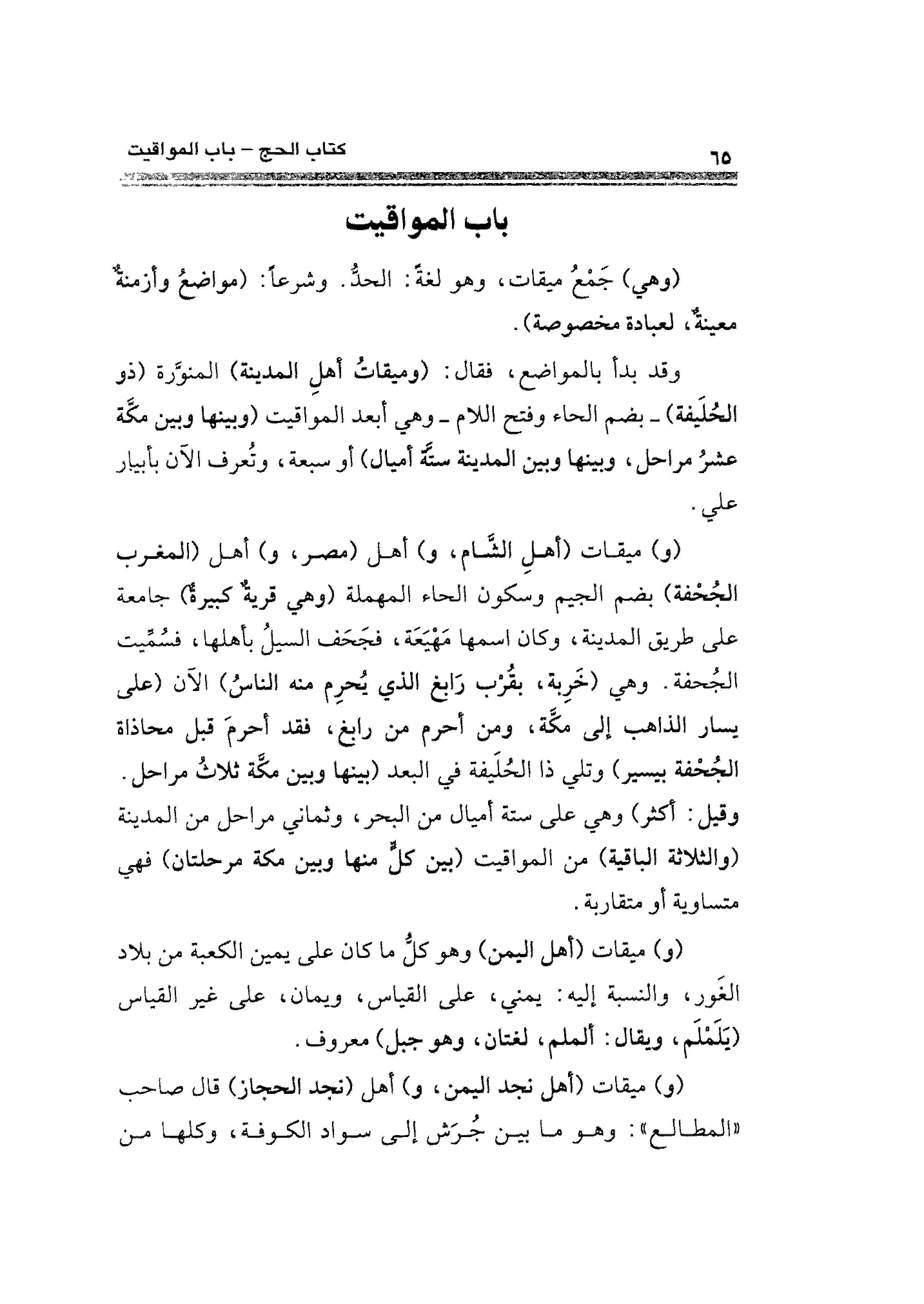 وقد بدأ بالمواضع، فقال: (وميقاتُ أهلِ المدينة) المنوَّرة (ذو الحُلَيفة) -بضم الحاء وفتح اللام- وهي أبعد المواقيت (وبينها وبين مكة عشر مراحل، وبينها وبين المدينة ستة أميال) أو سبعة، وتُعرف الآن بأبيار علي.