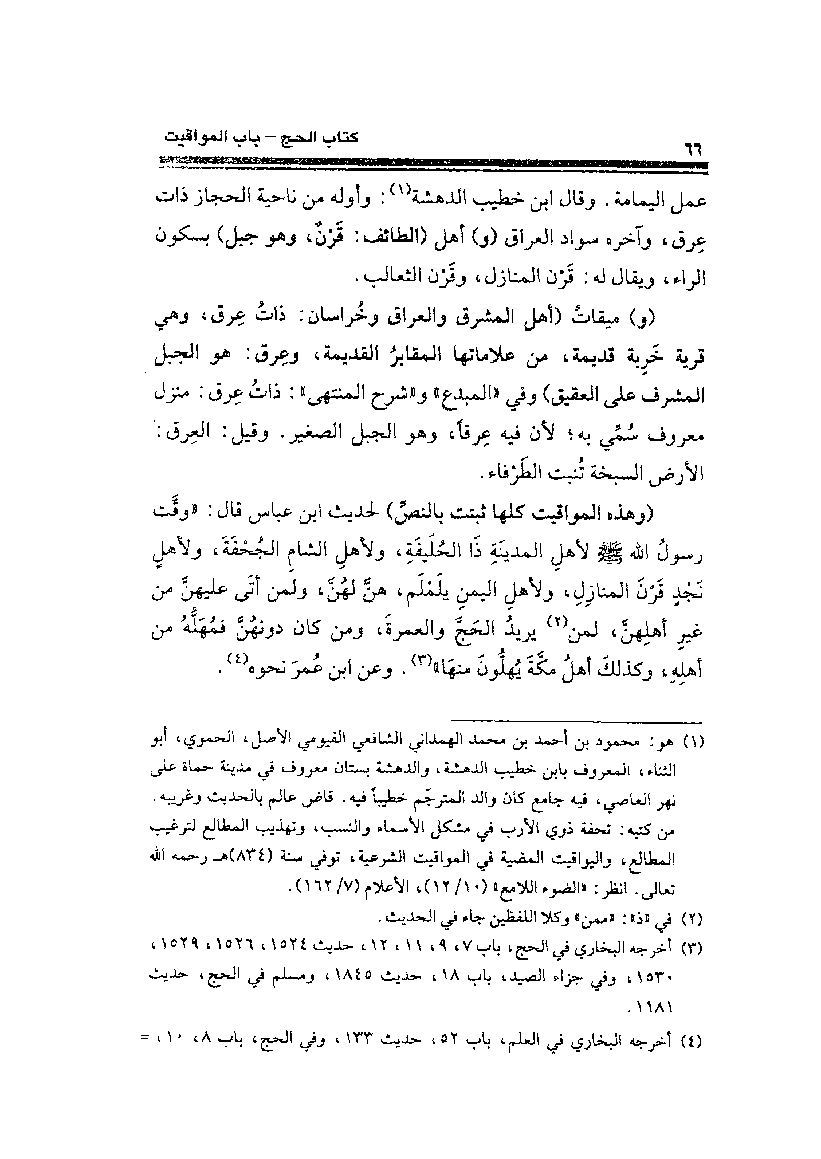 (¬٣) أخرجه البخاري في الحج، باب ٧، ٩، ١١، ١٢، حديث ١٥٢٤، ١٥٢٦، ١٥٢٩، ١٥٣٠، وفي جزاء الصيد، باب ١٨، حديث ١٨٤٥، ومسلم في الحج، حديث ١١٨١.