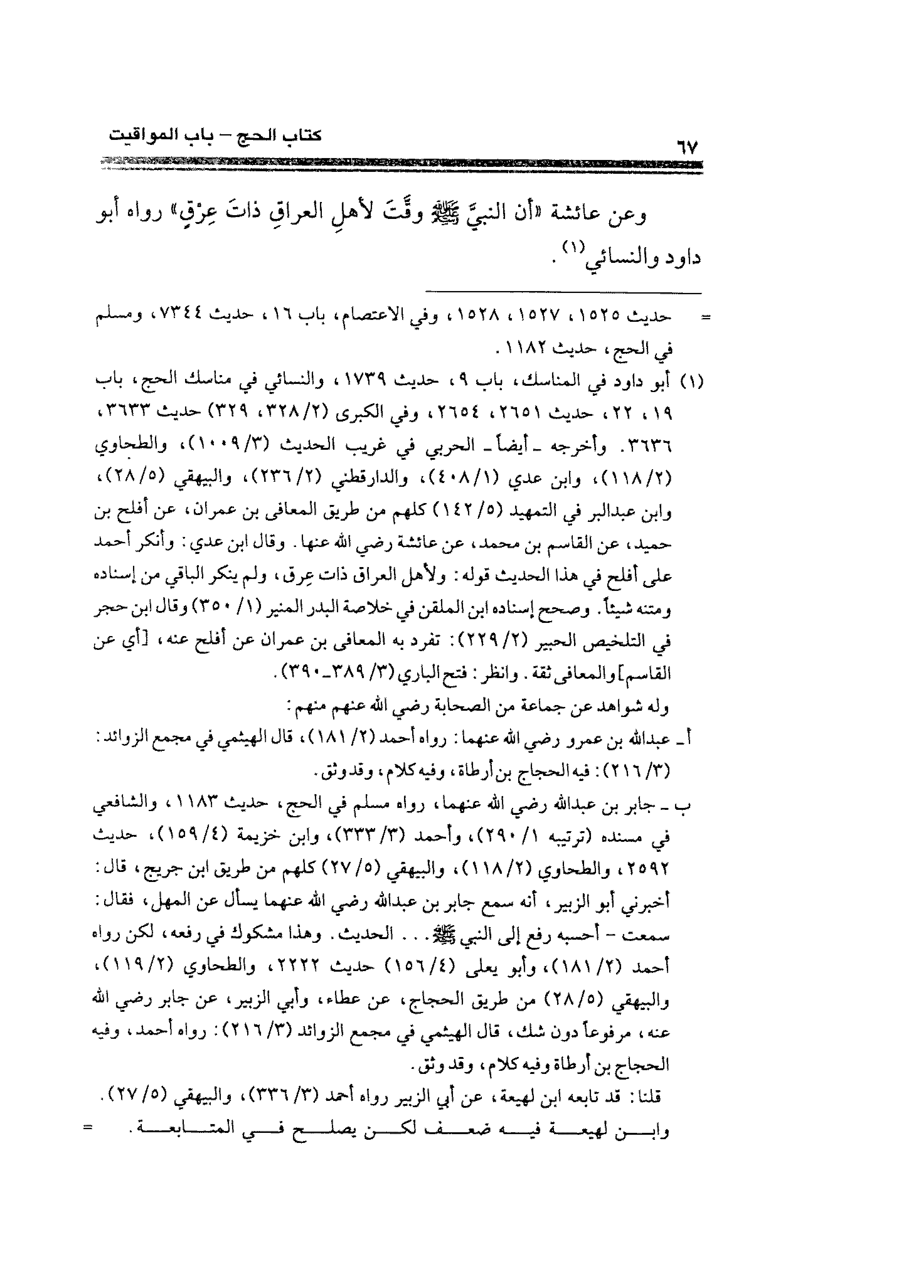 (¬١) أبو داود في المناسك، باب ٩، حديث ١٧٣٩، والنسائي في مناسك الحج، باب ١٩، ٢٢، حديث ٢٦٥١، ٢٦٥٤، وفي الكبرى (٢/ ٣٢٨، ٣٢٩) حديث ٣٦٣٣، ٣٦٣٦. وأخرجه -أيضًا- الحربي في غريب الحديث (٣/ ١٥٠٩)، والطحاوي (٢/ ١١٨)، وابن عدي (١/ ٤٠٨)، والدارقطني (٢/ ٢٣٦)، والبيهقي (٥/ ٢٨)، وابن عبد البر في التمهيد (٥/ ١٤٢) كلهم من طريق المعافى بن عمران، عن أفلح بن حميد، عن القاسم بن محمَّد، عن عائشة رضي الله عنها. وقال ابن عدي: وأنكر أحمد على أفلح في هذا الحديث قوله: ولأهل العراق ذات عِرق، ولم ينكر الباقي من إسناده ومتنه شيئًا. وصحح إسناده ابن الملقن في خلاصة البدر المنير (١/ ٣٥٠) وقال ابن حجر في التلخيص الحبير (٢/ ٢٢٩): تفرد به المعافى بن عمران عن أفلح عنه، [أي عن القاسم] والمعافي ثقة. وانظر: فتح الباري (٣/ ٣٨٩ - ٣٩٠).