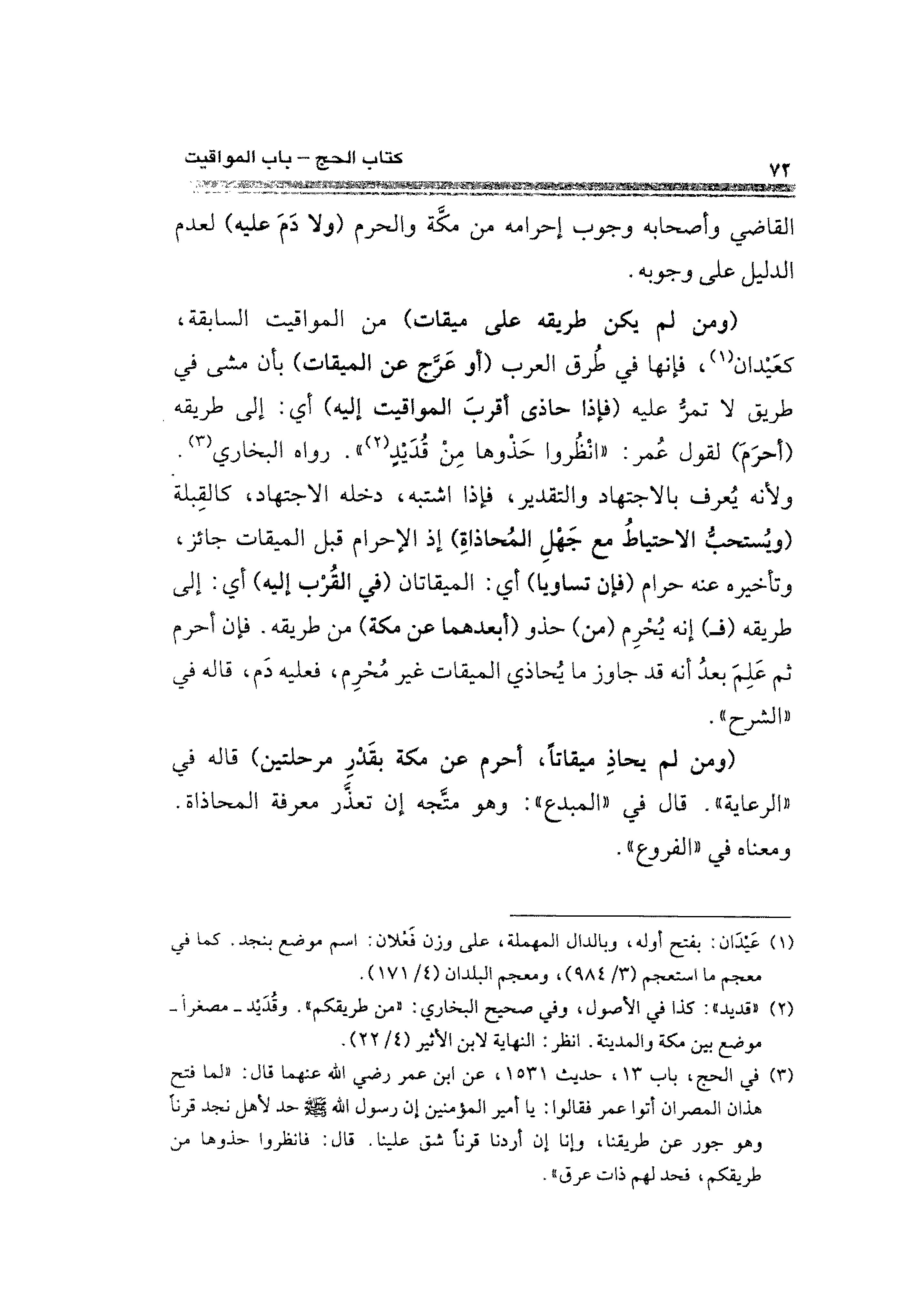 (¬٣) في الحج، باب ١٣، حديث ١٥٣١، عن ابن عمر رضي الله عنهما قال: "لما فتح هذان المصران أتوا عمر فقالوا: يا أمير المؤمنين إن رسول الله - صلى الله عليه وسلم - حد لأهل نجد قرنًا وهو جور من طريقنا، وإنا إن أردنا قرنًا شق علينا، قال: فانظروا حذوها من طريقكم، فحد لهم ذات عرق".