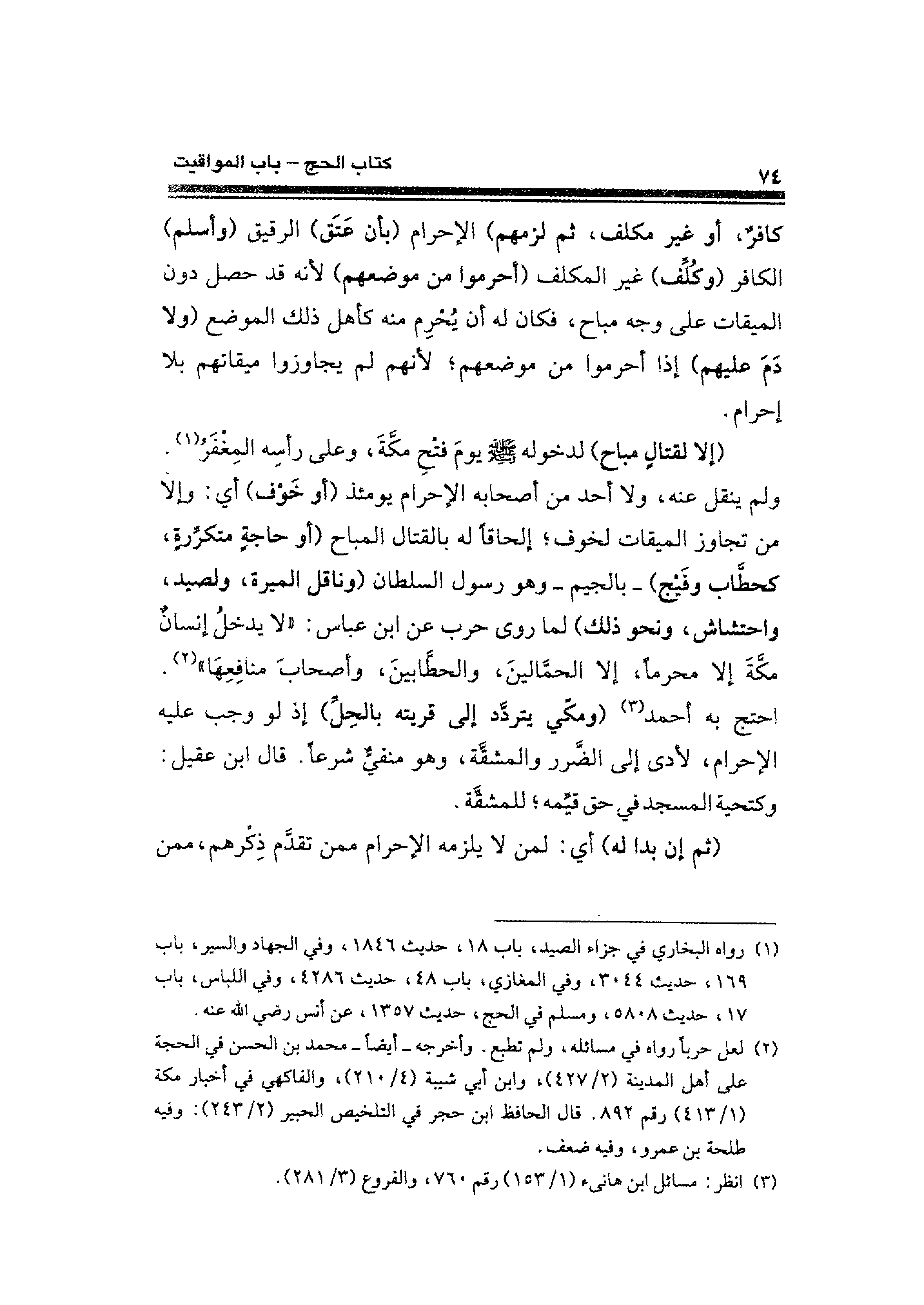 ولم ينقل عنه، ولا أحد من أصحابه الإحرام يومئذ (أو خَوف) أي: وإلا من تجاوز الميقات لخوف؛ إلحاقًا له بالقتال المباح (أو حاجةٍ متكرِّرةٍ، كحطَّاب وفَيْج) -بالجيم- وهو رسول السلطان (وناقل الميرة، ولصيد، واحتشاش، ونحو ذلك) لما روى حرب عن ابن عباس: "لا يدخلُ إنسانٌ مكَّةَ إلا محرمًا، إلا الحمَّالينَ، والحطَّابينَ، وأصحابَ منافِعِهَا" (¬٢).