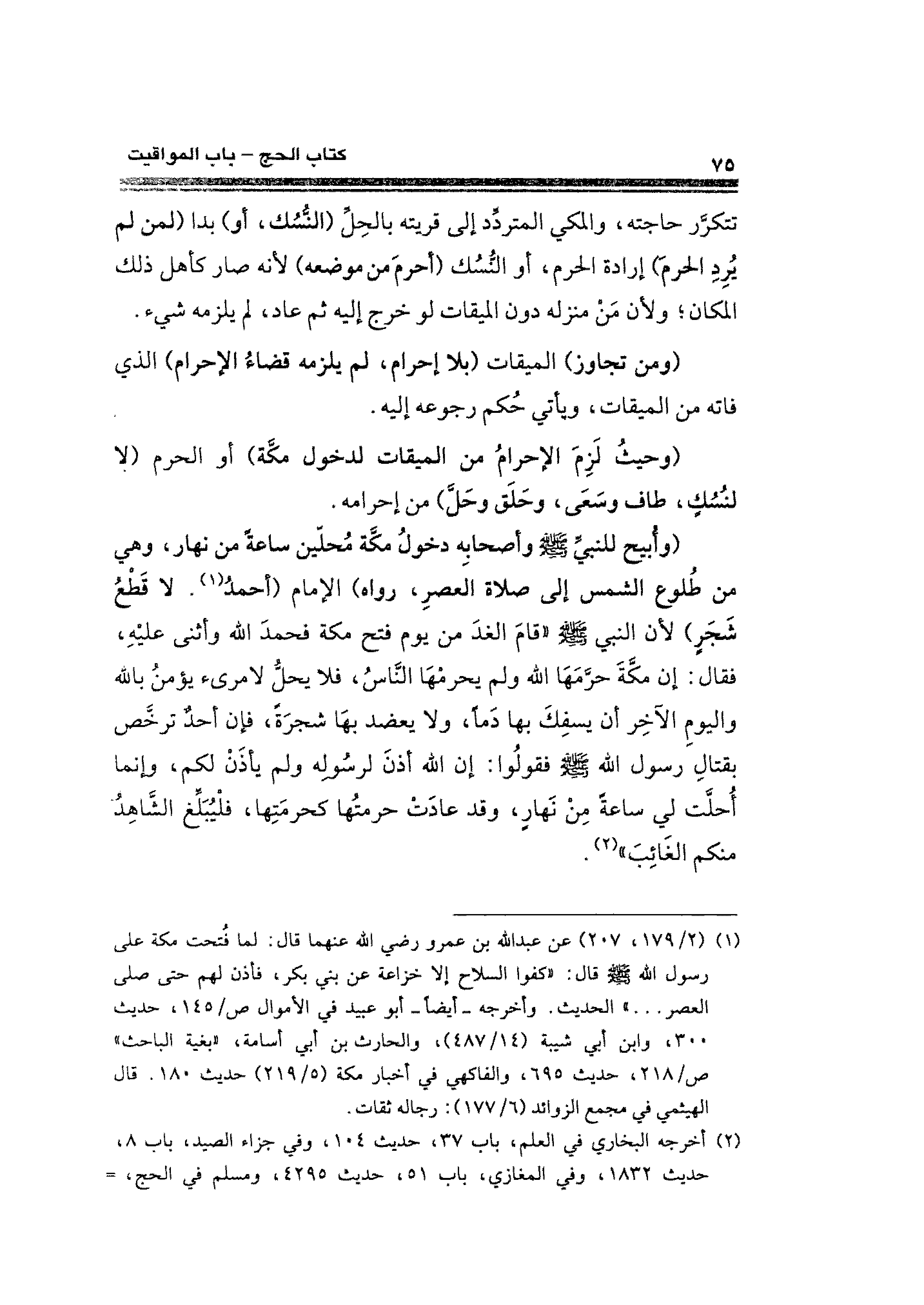 (وأُبيح للنبيِّ - صلى الله عليه وسلم - وأصحابِه دخولُ مكَّة مُحلّين ساعةً من نهار، وهي من طُلوع الشمس إلى صلاة العصرِ، رواه) الإمام (أحمدُ (¬١). لا قَطعُ شَجَرٍ) لأن النبي - صلى الله عليه وسلم - "قامَ الغدَ من يوم فتح مكة فحمدَ الله وأثنى عليْهِ، فقال: إن مكَّةَ حرَّمَهَا الله ولم يحرمْهَا النَّاسُ، فلا يحلُّ لامرئ يؤمنُ بالله واليوم الآخِر أن يسفِكَ بها دَمًا، ولا يعضد بِهَا شجرَةٌ، فإن أحدٌ ترخَّص بقتالِ رسول الله - صلى الله عليه وسلم - فقولُوا: إن الله أذنَ لرسُوله ولم يأذَنْ لكم، وإنما أُحلَّت لي ساعةً منْ نَهارٍ، وقد عادَتْ حرمتُها كحرمَتِها، فلْيُبَلِّغ الشَّاهِدُ منكم الغَائِبَ" (¬٢).