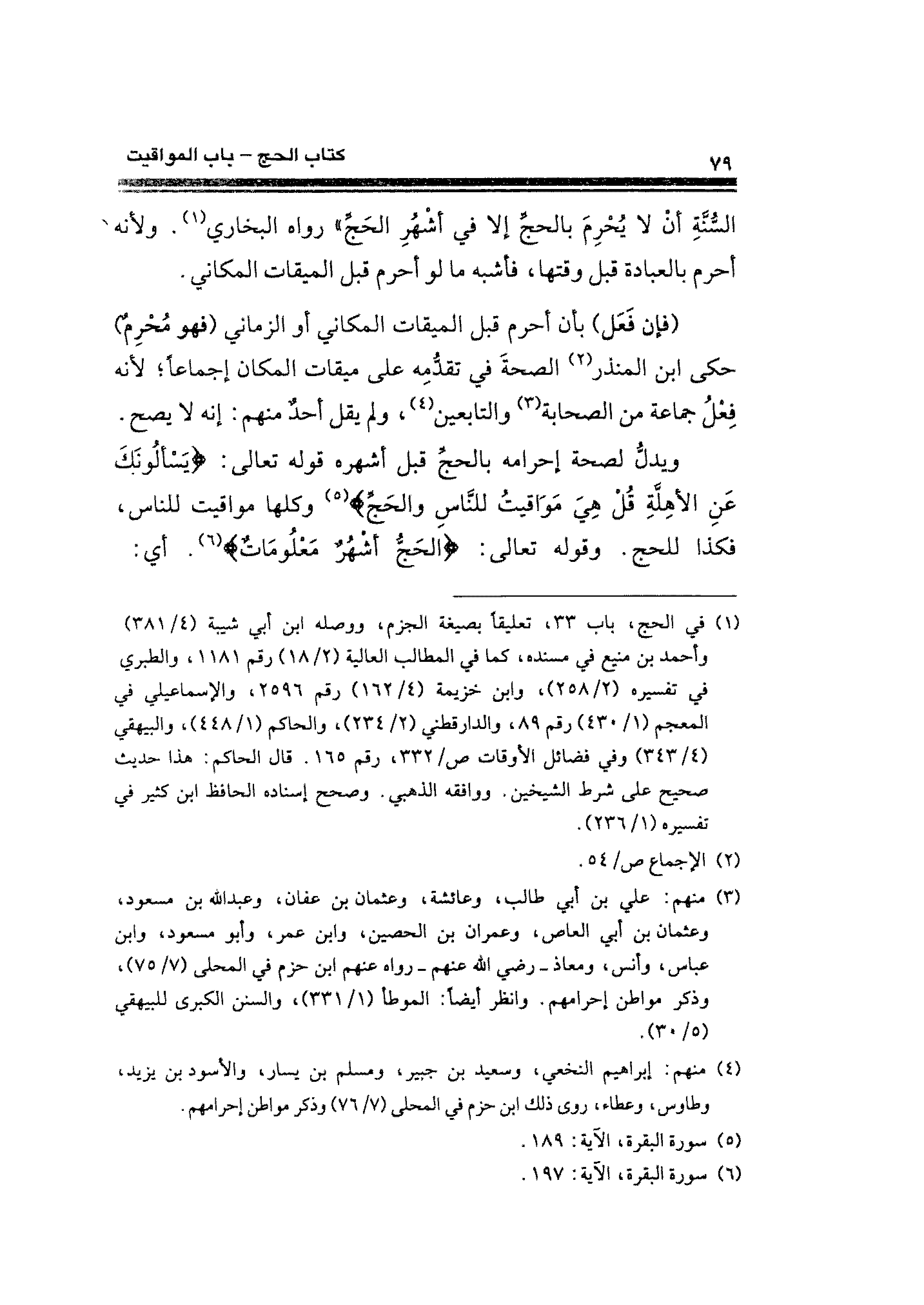 (¬٣) منهم: علي بن أبي طالب، وعائشة، وعثمان بن عفان، وعبد الله بن مسعود، وعثمان بن أبي العاص، وعمران بن الحصين، وابن عمر، وأبو مسعود، وابن عباس، وأنس، ومعاذ - رضي الله عنهم - رواه عنهم ابن حزم في المحلى (٧/ ٧٥)، وذكر مواطن إحرامهم. وانظر أيضًا: الموطأ (١/ ٣٣١)، والسنن الكبرى للبيهقي (٥/ ٣٠).