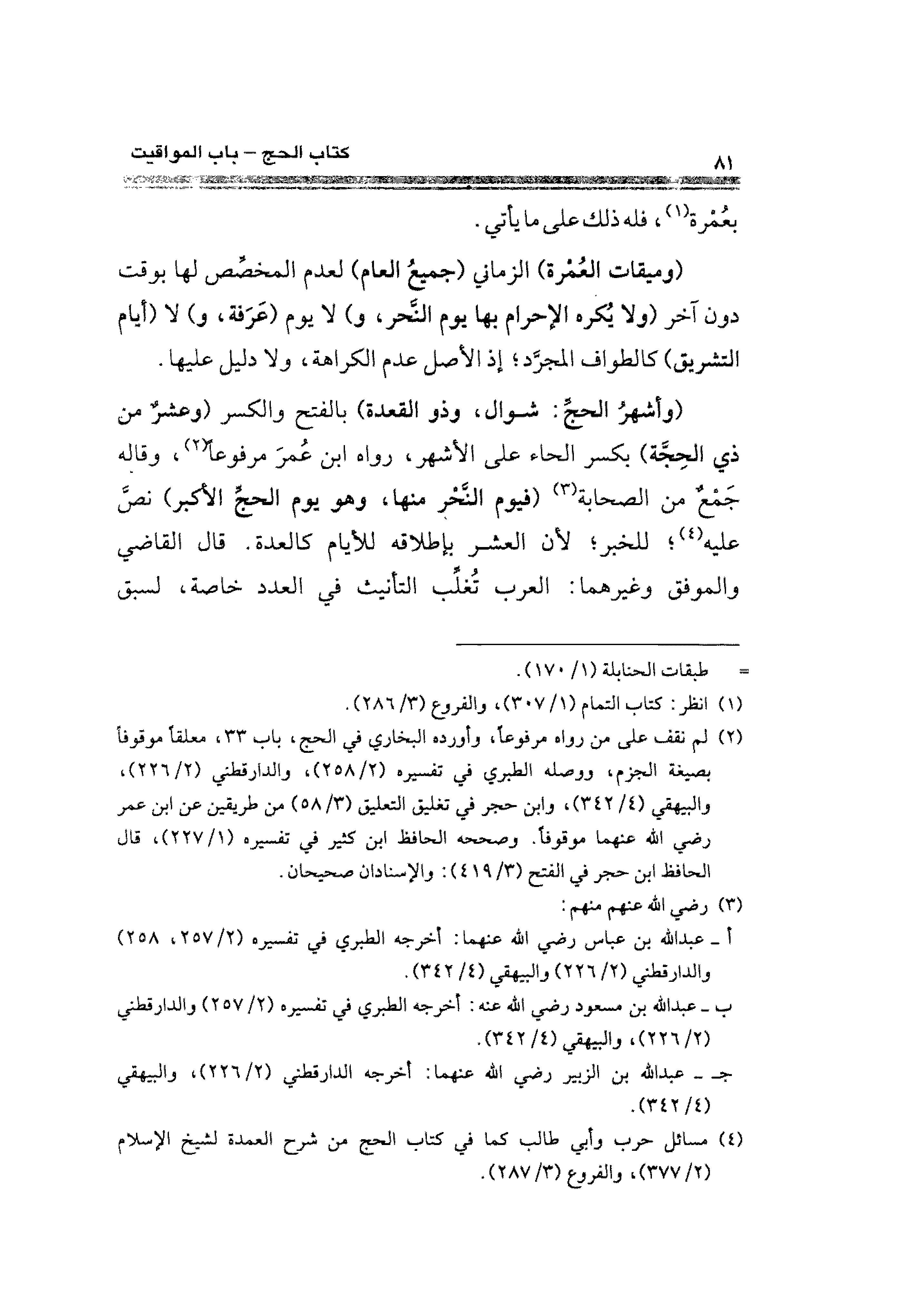 (وأشهرُ الحجِّ: شوال، وذو القعدة) بالفتح والكسر (وعشرٌ من ذي الحِجَّة) بكسر الحاء على الأشهر، رواه ابن عُمرَ مرفوعًا (¬٢)، وقاله جَمْعٌ في الصحابة (¬٣) (فيوم النَّحْر عنها، وهو يوم الحجِّ الأكبر) نصٌّ عليه (¬٤)؛ للخبر؛ لأن العشر بإطلاقه للأيام كالعدة. قال القاضي والموفق وغيرهما: العرب تُغلِّب التأنيث في العدد خاصة، لسبق