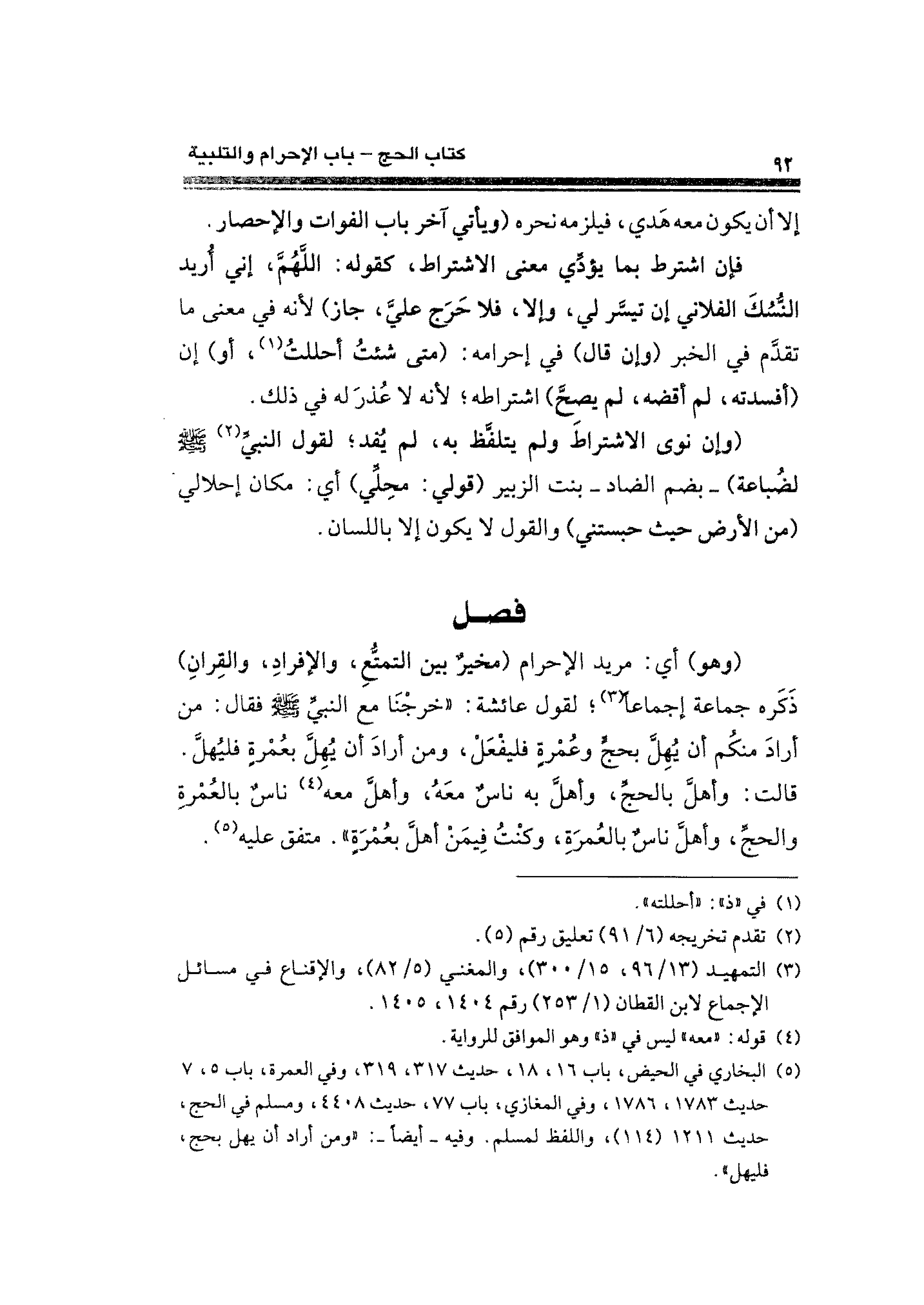 فإن اشترط بما يؤدي معنى الاشتراط، كقوله: اللَّهُمَّ، إني أُريد النُّسُكَ الفلاني إن تَيسَّر لي، وإلا، فلا حَرَج عليَّ، جاز) لأنه في معنى ما تقدَّم في الخبر (وإن قال) في إحرامه: (متى شئتُ أحللتُ (¬١)، أو) إن (أفسدته، لم أقضه، لم يصحَّ) اشتراطه؛ لأنه لا عُذرَ له في ذلك.