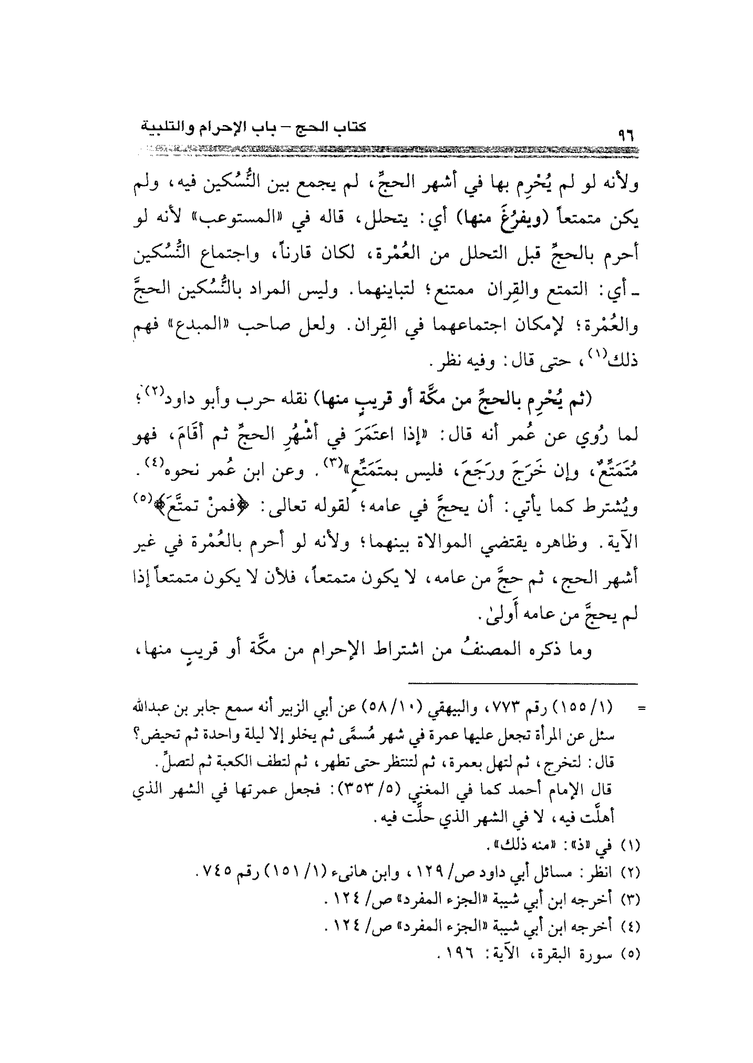ولأنه لو لم يُحْرِم بها في أشهر الحجِّ، لم يجمع بين النُّسُكين فيه، ولم يكن متمتعًا (ويفرُغَ منها) أي: يتحلل، قاله في "المستوعب" لأنه لو أحرم بالحجِّ قبل التحلل من العُمْرة، لكان قارنًا، واجتماع النُّسُكين -أي: التمتع والقِران ممتنع؛ لتباينهما. وليس المراد بالنُّسُكين الحجَّ والعُمْرة؛ لإمكان اجتماعهما في القِران. ولعل صاحب "المبدع" فهم ذلك (¬١)، حتى قال: وفيه نظر.