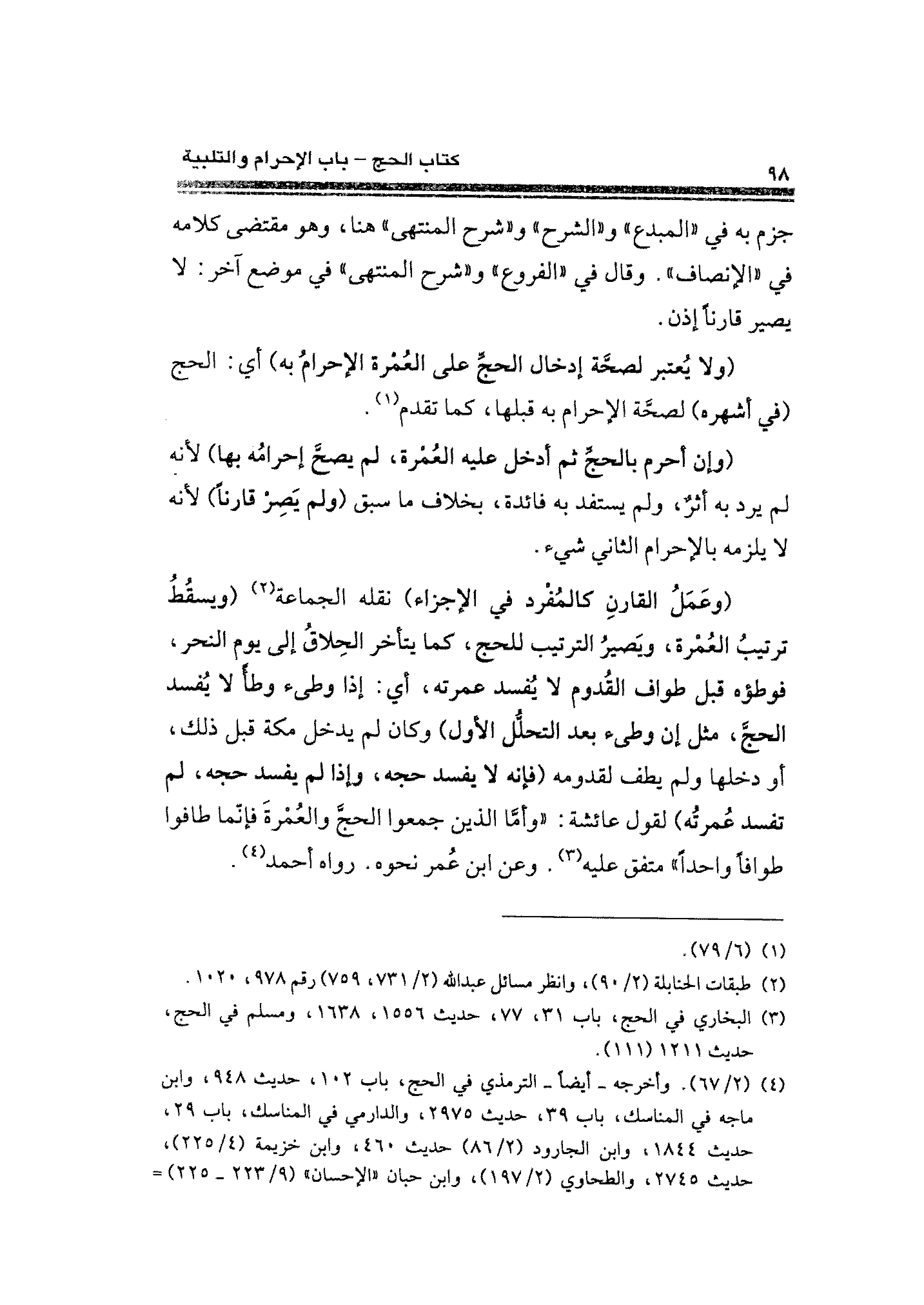 (وعَمَلُ القارنِ كالمُفْرد في الإجزاء) نقله الجماعة (¬٢) (ويسقُطُ ترتيبُ العُمْرة، ويصيرُ الترتيب للحج، كما يتأخر الحِلاقُ إِلى يوم النحر، فوطؤه قبل طواف القُدوم لا يُفسد عمرته، أي: إذا وطئ وطأً لا يُفسد الحجَّ، مثل إن وطئ بعد التحلُّل الأول) وكان لم يدخل مكة قبل ذلك، أو دخلها ولم يطف لقلومه (فإنه لا يُفسد حجه، واذا لم يفسد حجه، لم تفسد عمرته) لقول عائشة: "وأما الذين جمعوا الحجَّ والعُمْرةَ فإنما طافوا طوافًا واحدًا" متفق عليه (¬٣). وعن ابن عمر نحوه. رواه أحمد (¬٤).