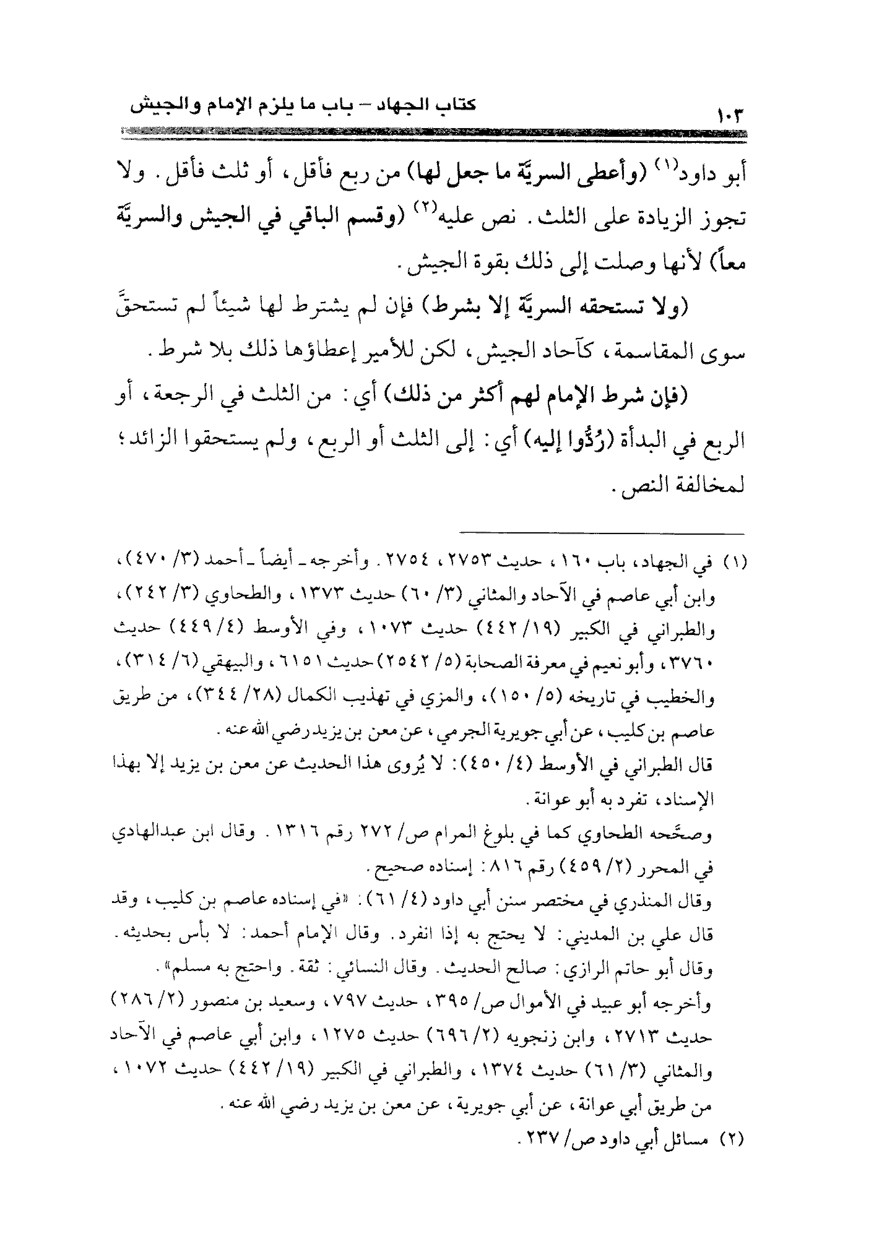 (¬١) في الجهاد، باب ١٦٠، حديث ٢٧٥٣، ٢٧٥٤. وأخرجه -أيضًا- أحمد (٤٧٠/ ٣)، وابن أبي عاصم في الآحاد والمثاني (٣/ ٦٥) حديث ١٣٧٣، والطحاوي (٣/ ٢٤٢)، والطبراني في الكبير (١٩/ ٤٤٢) حديث ١٠٧٣، وفي الأوسط (٤/ ٤٤٩) حديث ٣٧٦٠، وأبو نعيم في معرفة الصحابة (٥/ ٢٥٤٢) حديث ٦١٥١، والبيهقي (٦/ ٣١٤)، والخطيب في تاريخه (٥/ ١٥٠)، والمزي في تهذب الكمال (٢٨/ ٣٤٤)، من طريق عاصم بن كليب، عن أبي جويرية الجرمي، عن معن بن يزيد رضي الله عنه.