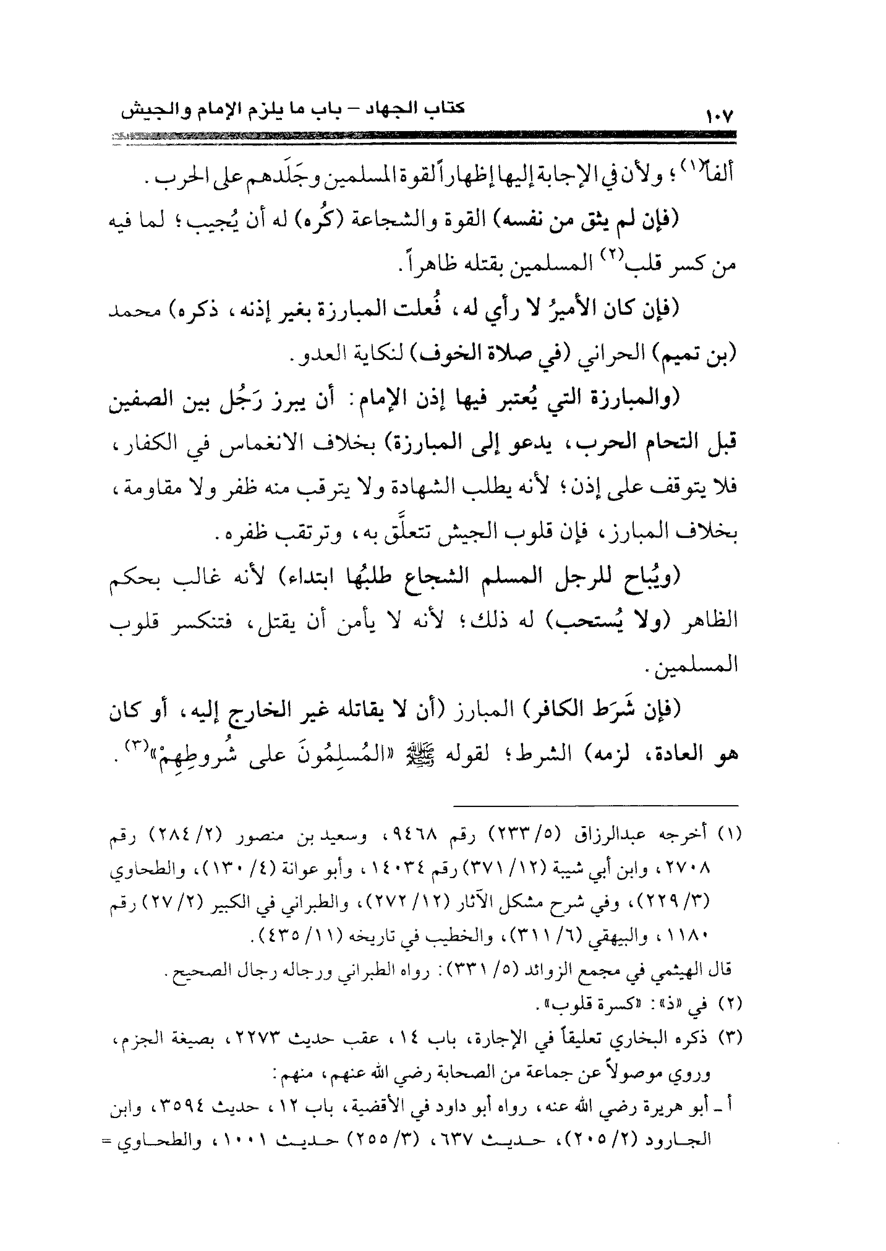 (فإن شَرَط الكافر) المبارز (أن لا يقاتله غير الخارج إليه، أو كان هو العادة، لزمه) الشرط؛ لقوله - صلى الله عليه وسلم - "المسلِمُونَ على شُروطِهِمْ" (¬٣).