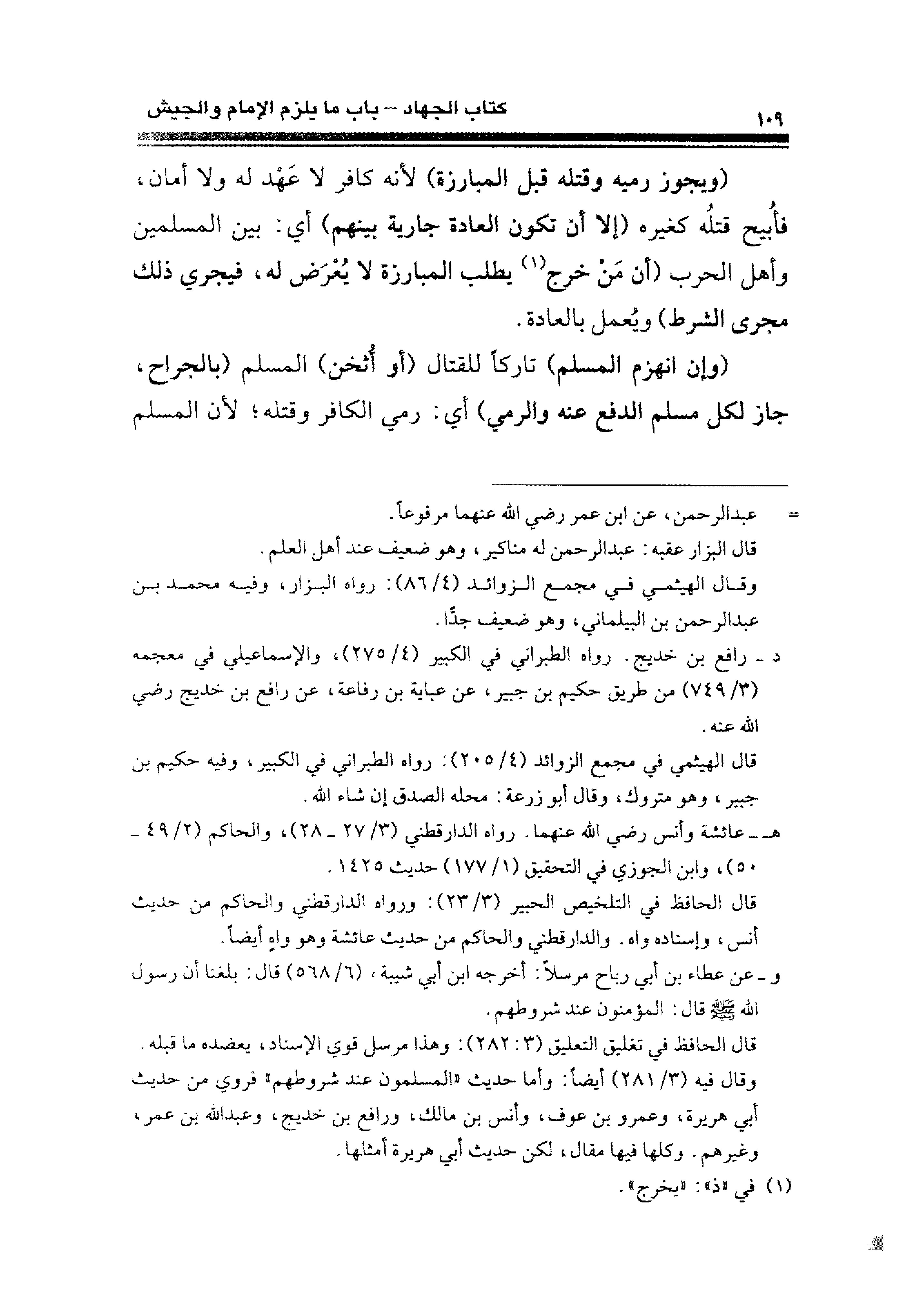 (ويجوز رميه وقتله قبل المبارزة) لأنة كافر لا عَهْد له ولا أمان، فأُبيح قتلُه كغيره (إلا أن تكون العادة جارية بينهم) أي: بين المسلمين وأهل الحرب (أن قد خرج (¬١) يطلب المبارزة لا يُعرَض. له، فيجري ذلك مجرى الشرط) ويُعمل بالعادة.