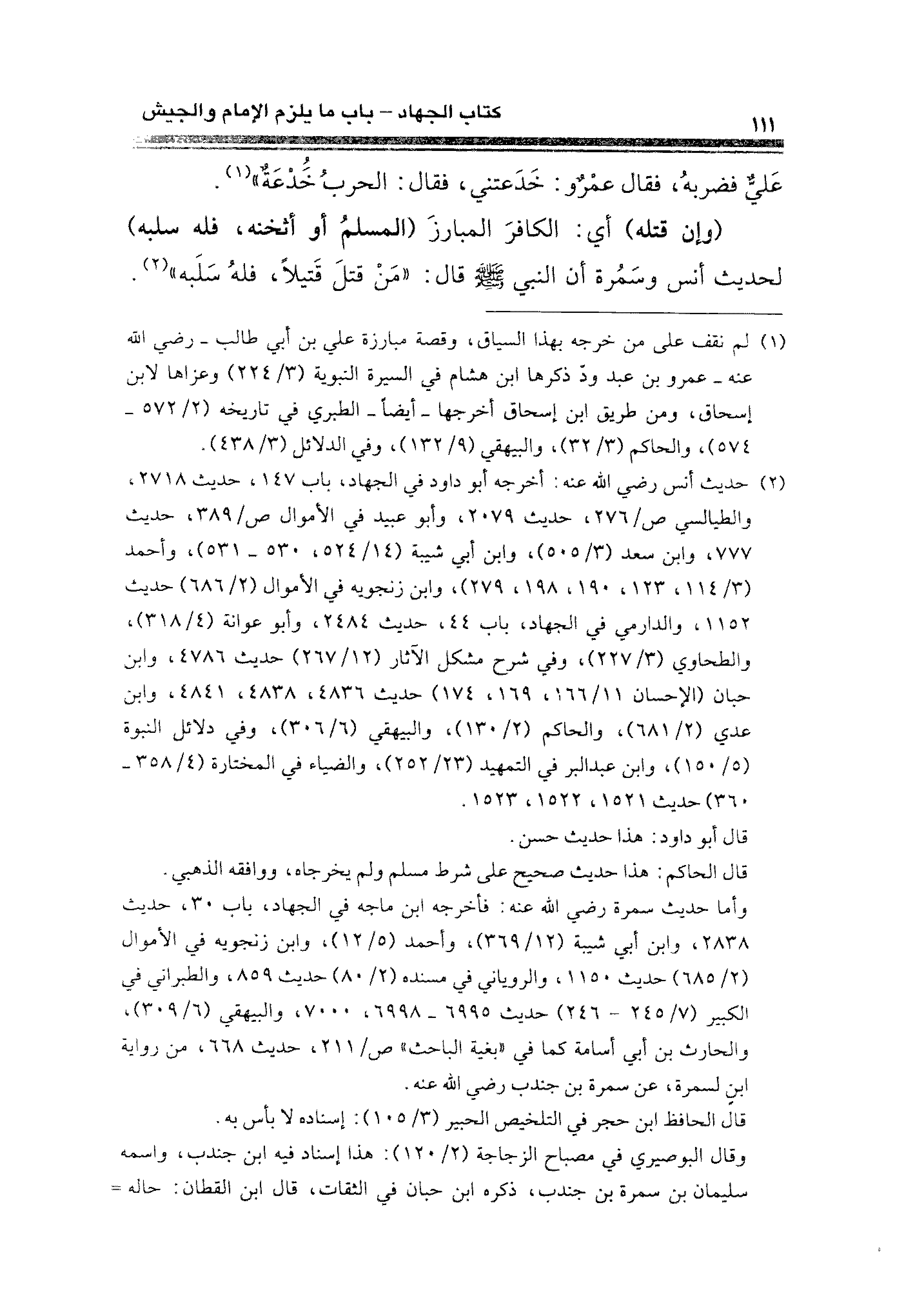 (¬١) لم نقف على من خرجه بهذا السياق، وقصة مبارزة علي بن أبي طالب -رضي الله عنه- عمرو بن عبد ود ذكرها ابن هشام في السيرة النبوية (٣/ ٢٢٤) وعزاها لابن إسحاق، ومن طريق ابن إسحاق أخرجها -أيضًا- الطبري في تاريخه (٢/ ٥٧٢ - ٥٧٤)، والحاكم (٣/ ٣٢)، والبيهقي (٩/ ١٣٢)، وفي الدلائل (٣/ ٤٣٨).
